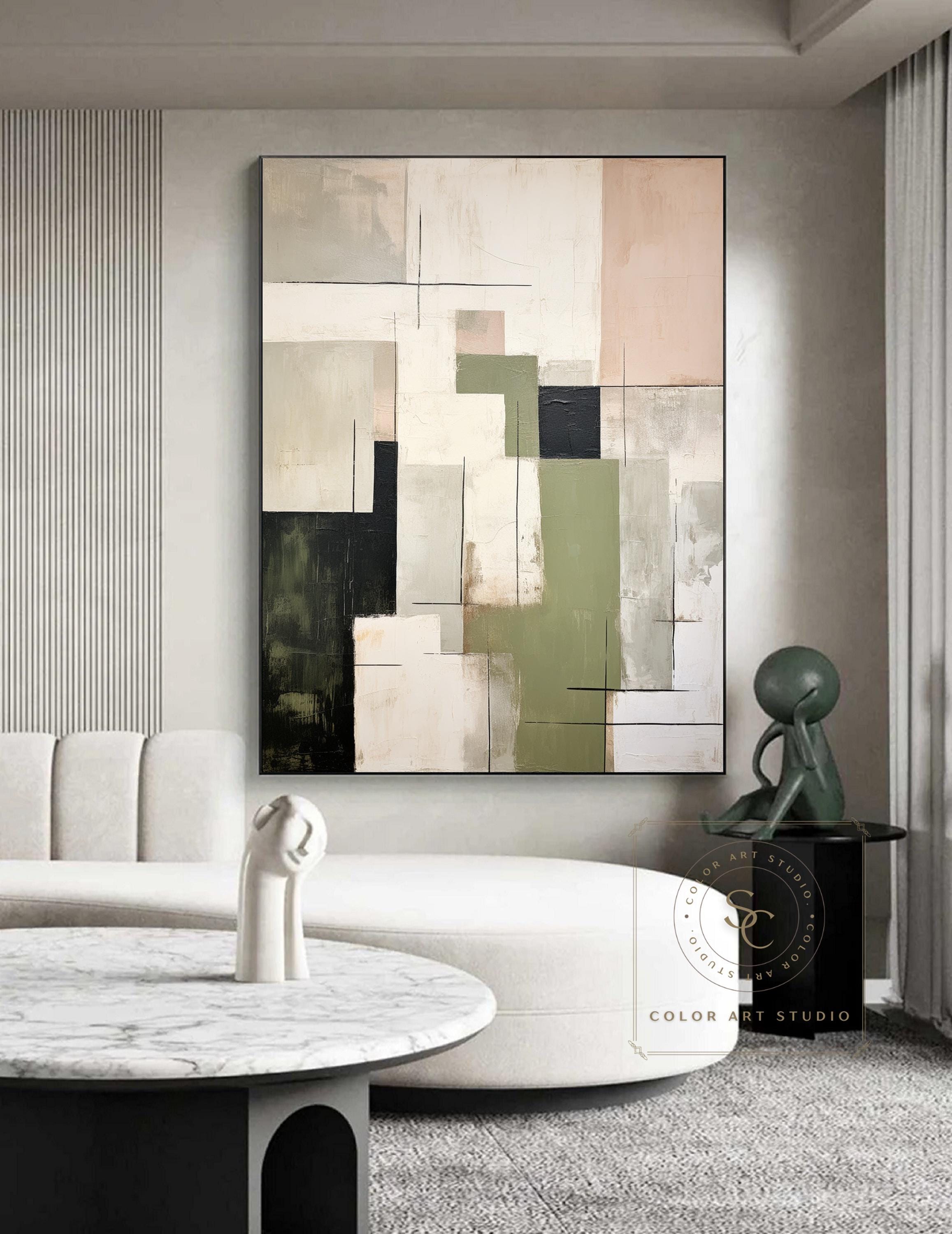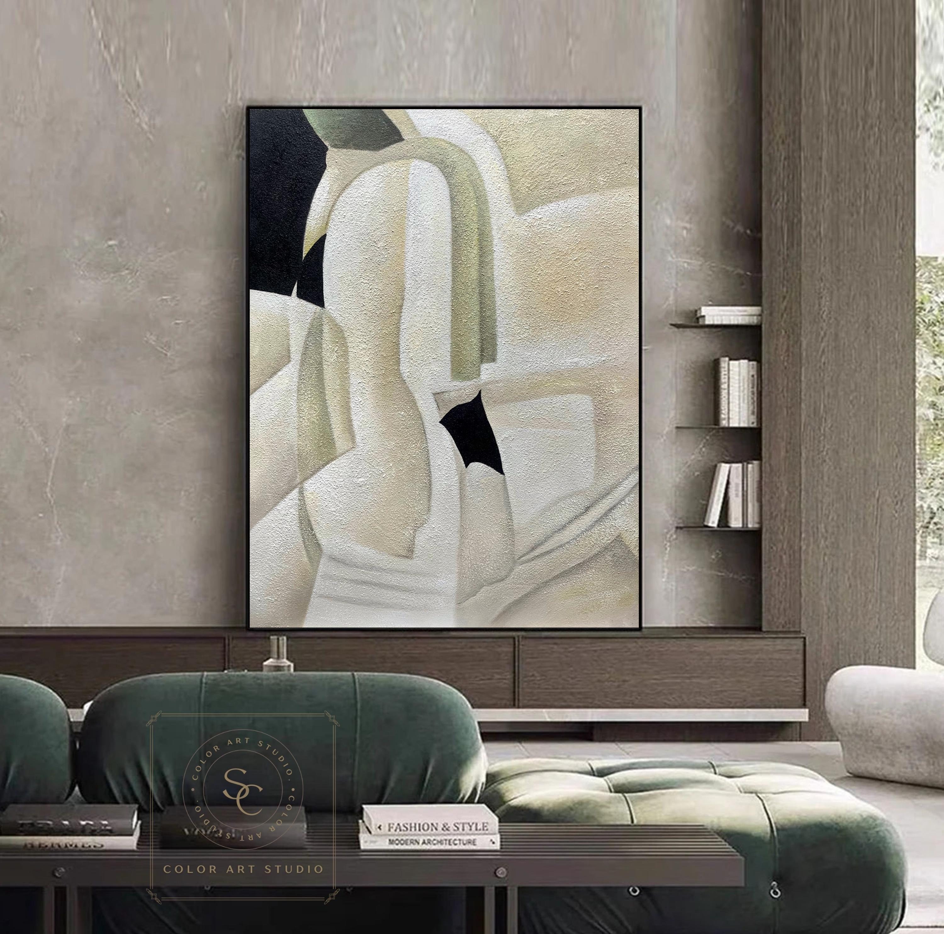 Beige Abstract Oil Painting Green Minimalist Painting Large Beige W...