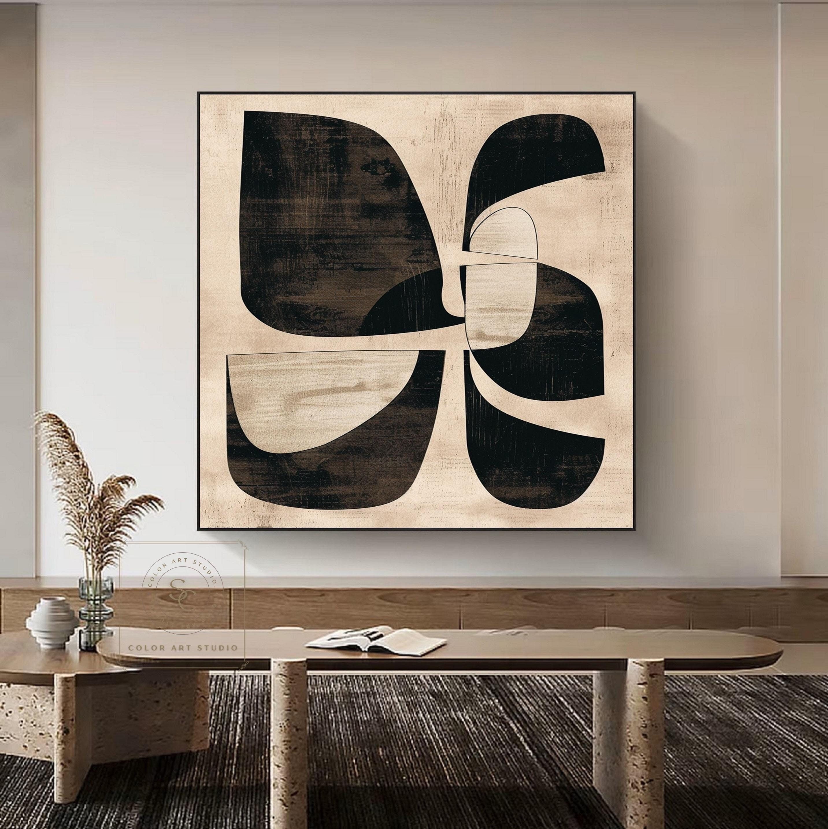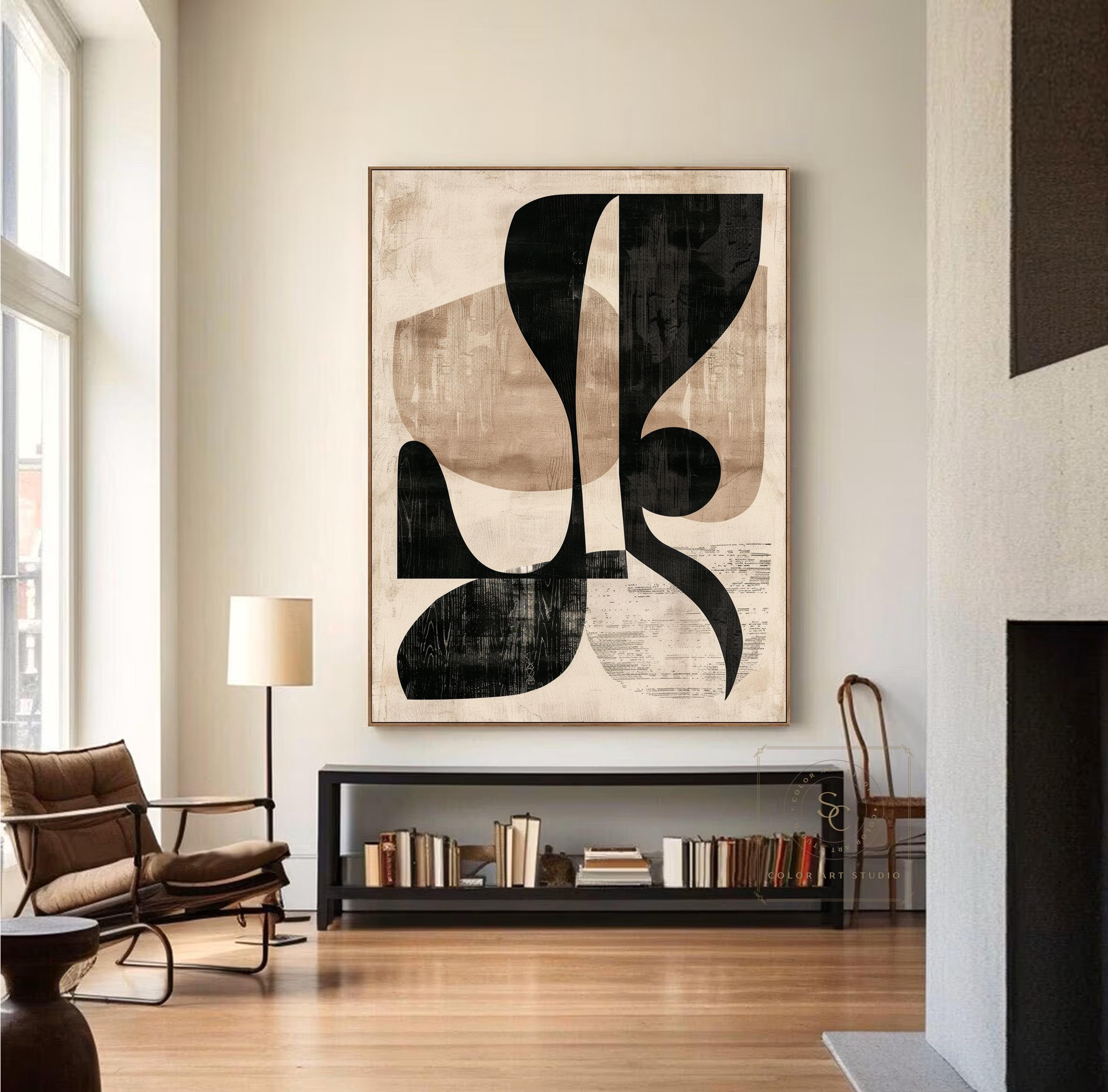 Large Beige Wall Art Original Black Abstract Painting Beige Minimal...