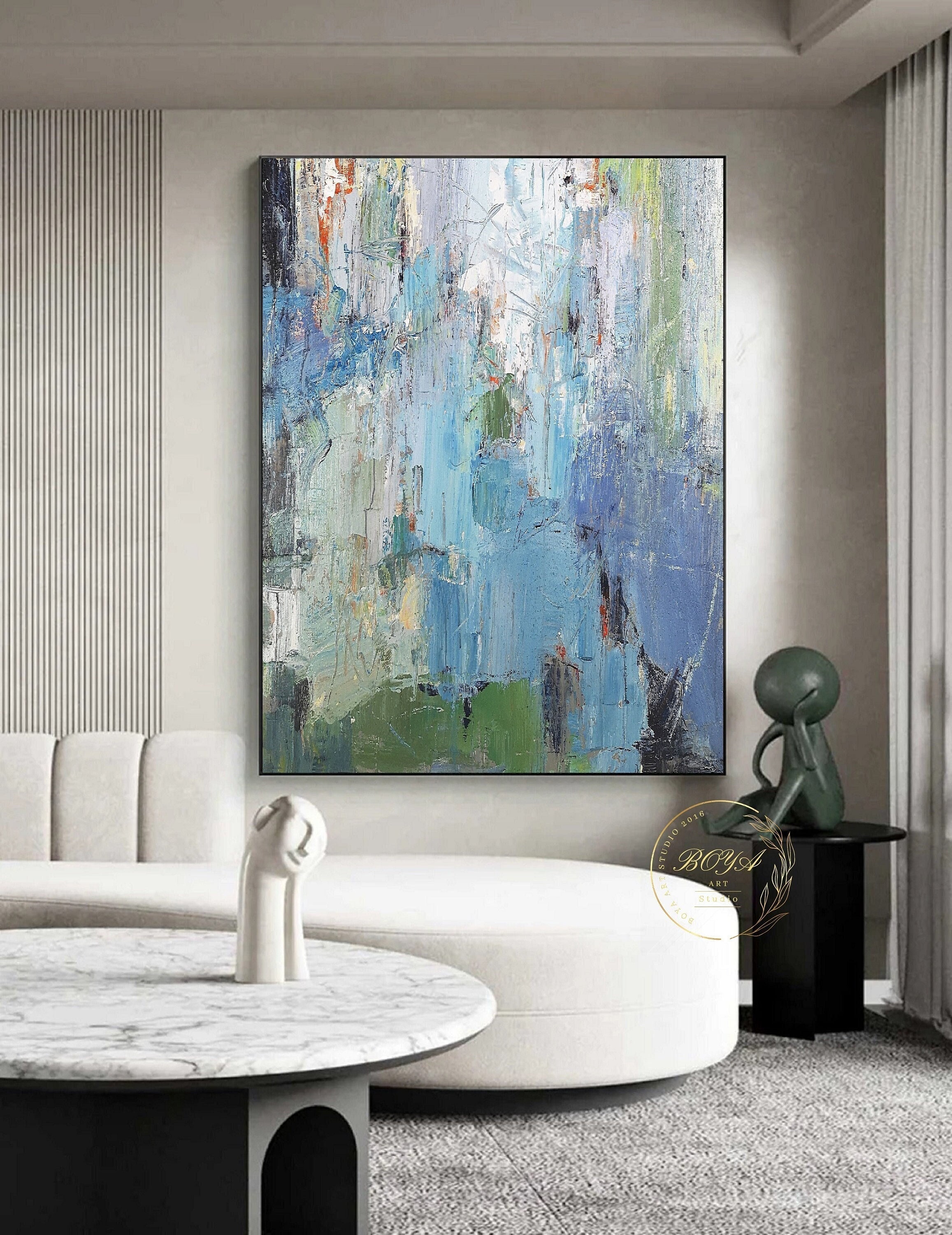 Large Blue Abstract Painting Original Green Oil Painting Modern Abs...