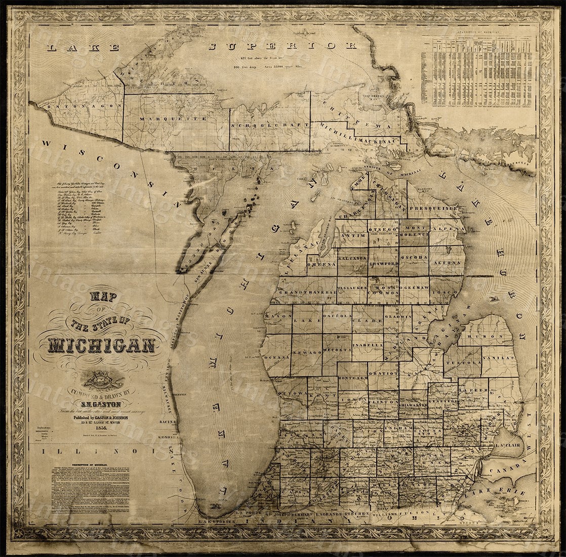 Vintage Michigan map 1856 old map of Michigan Old Antique Style Mic...
