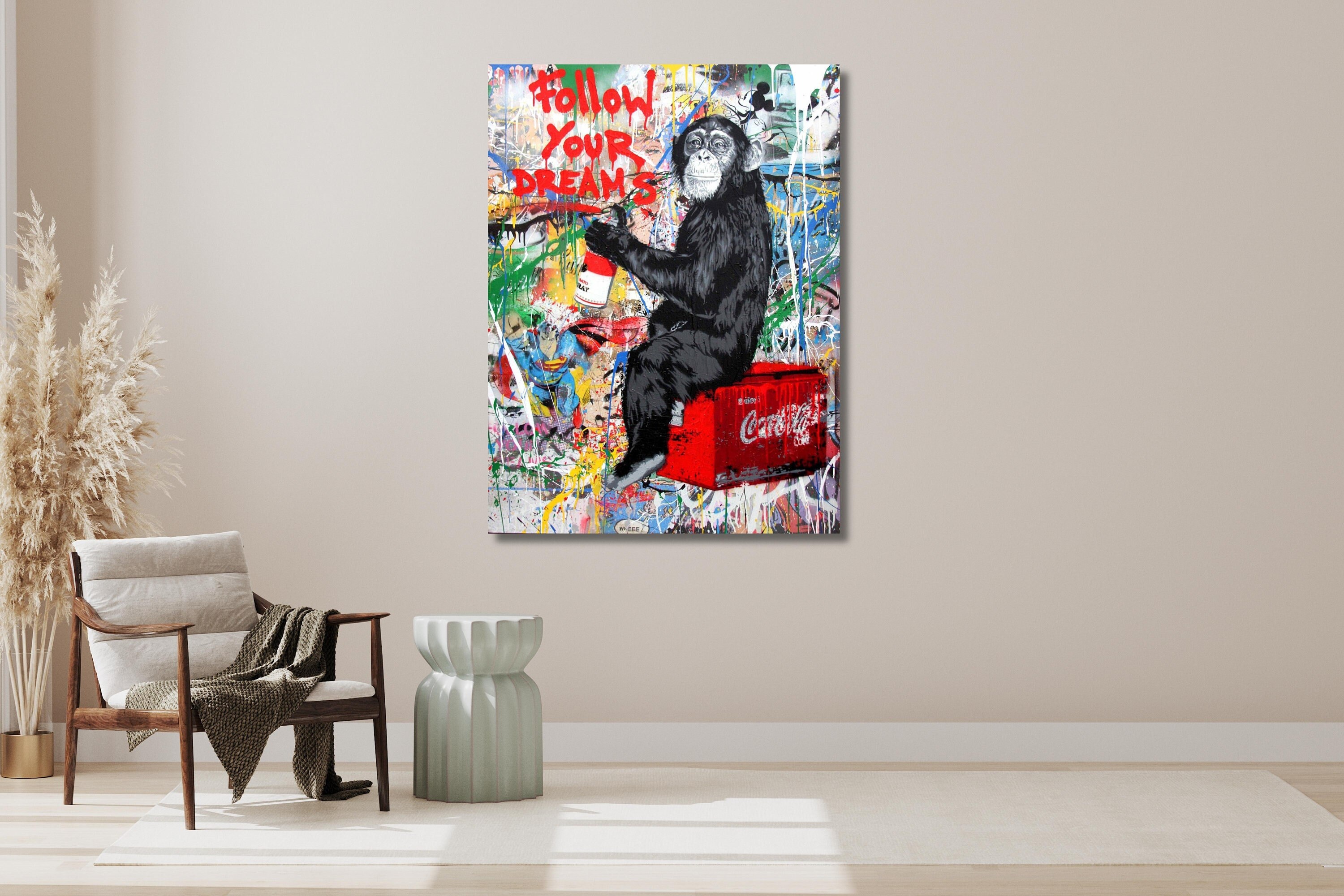 Follow Your Dreams, Banksy, Monkey Poster, Banksy Monkey Wall Art, Banksy Canvas Art, Banksy Colorfu...