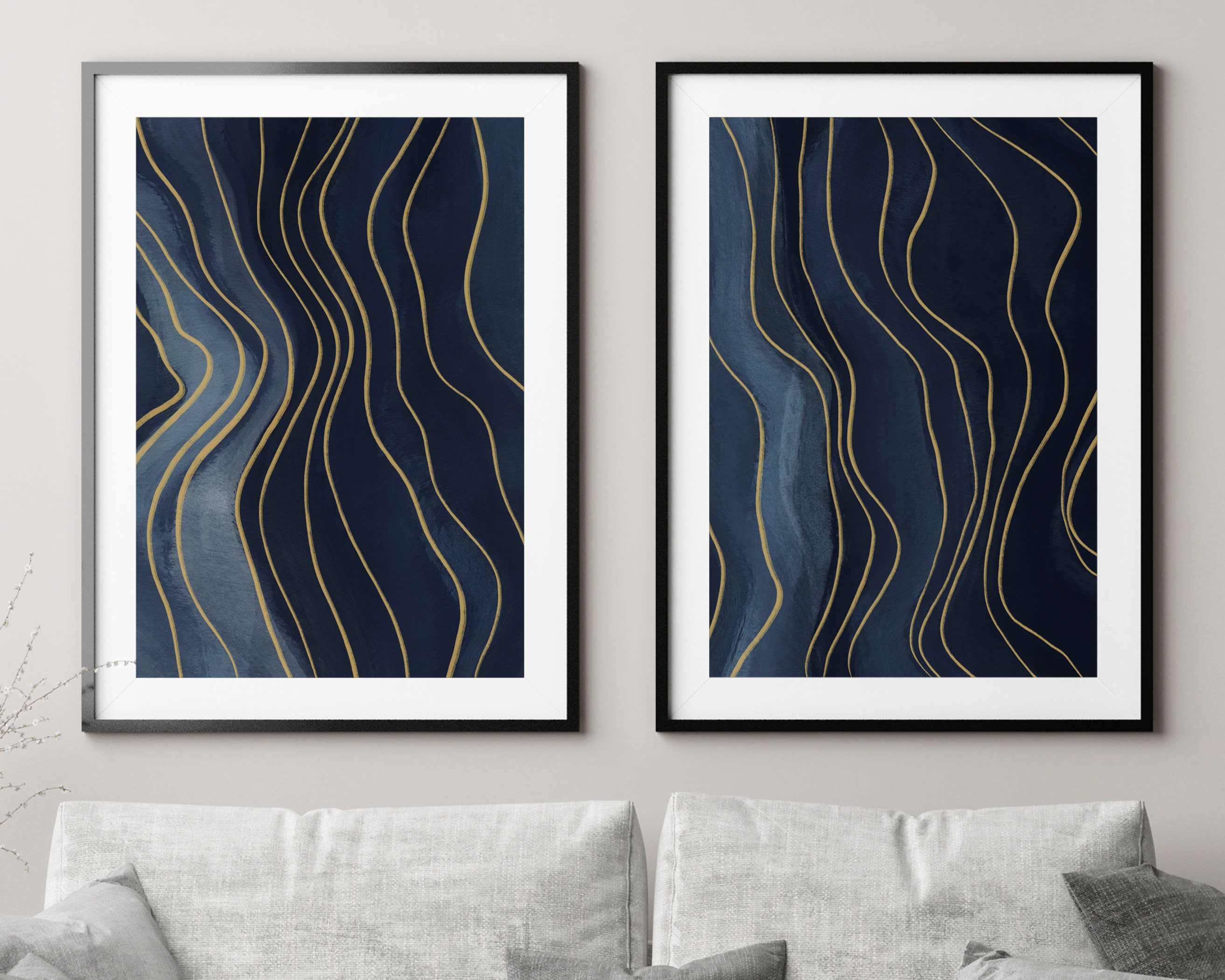 Abstract Navy Blue and Gold Prints Set of 2, Blue Wall Art Print Se...