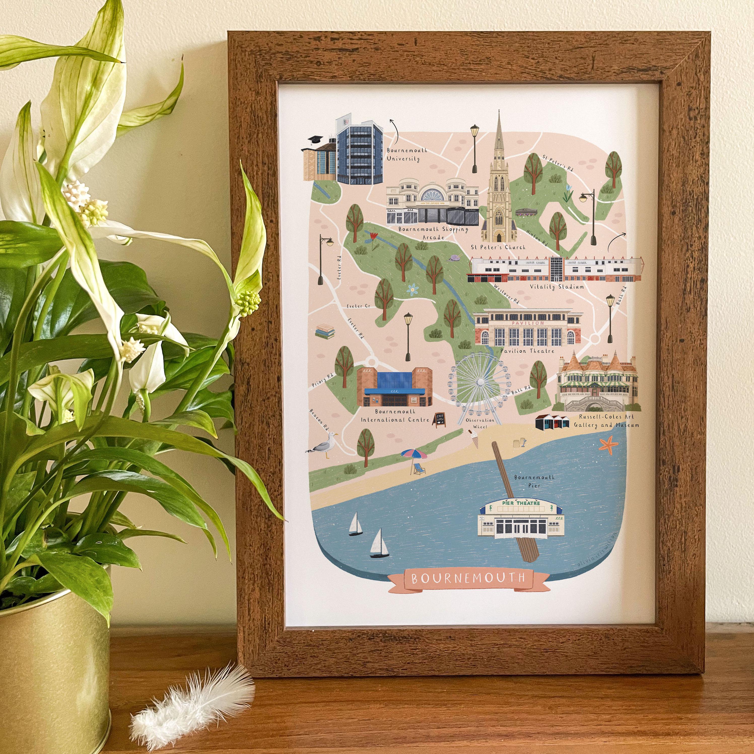 Bournemouth Map, Illustrated Map of Bournemouth, Bournemouth Poster...