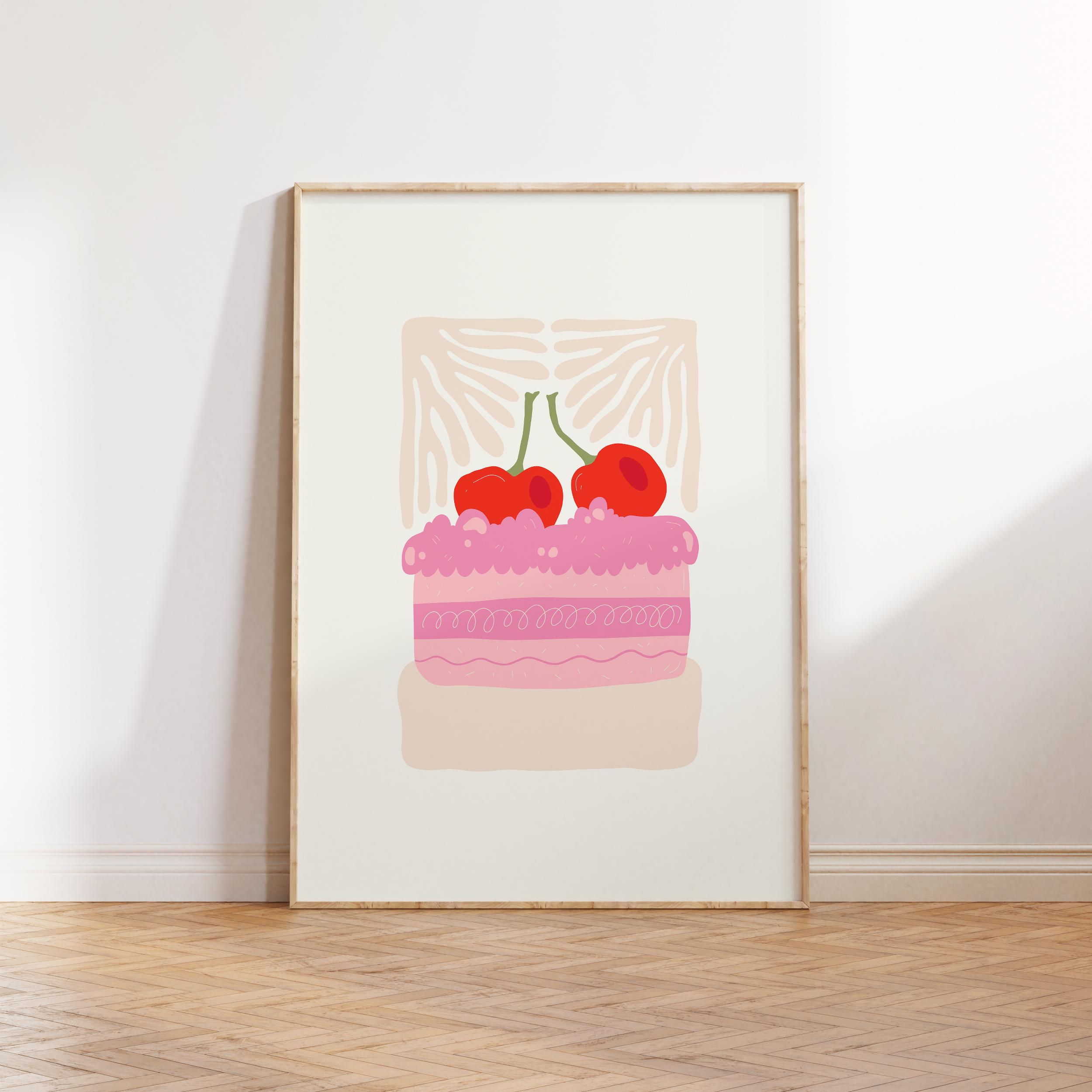 Cake Food Art Poster, Birthday Cake Cherries Wall Art Print, Vanill...