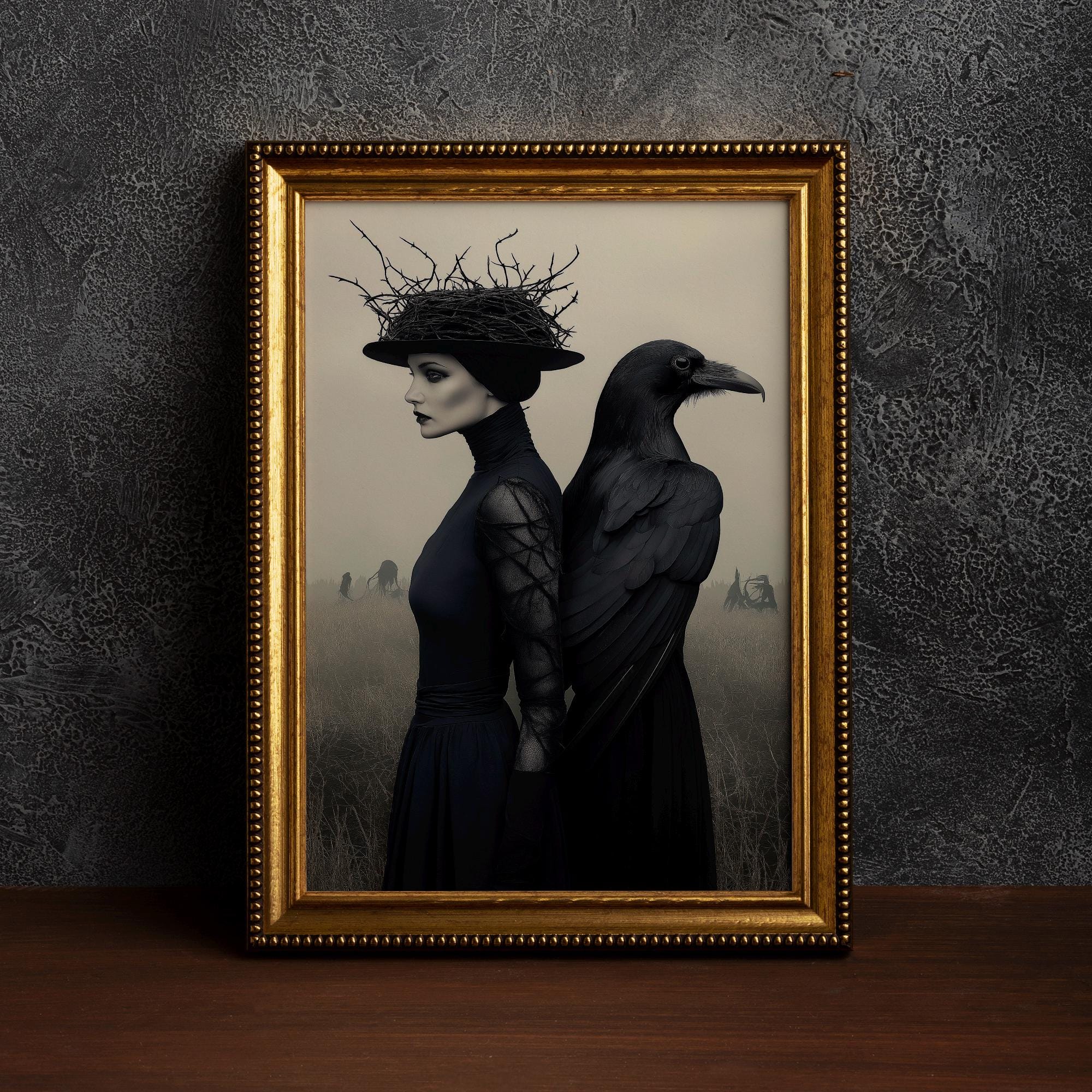 Raven and Witch -Gothic Crow,Animal Portrait,Dark Academia Raven an...