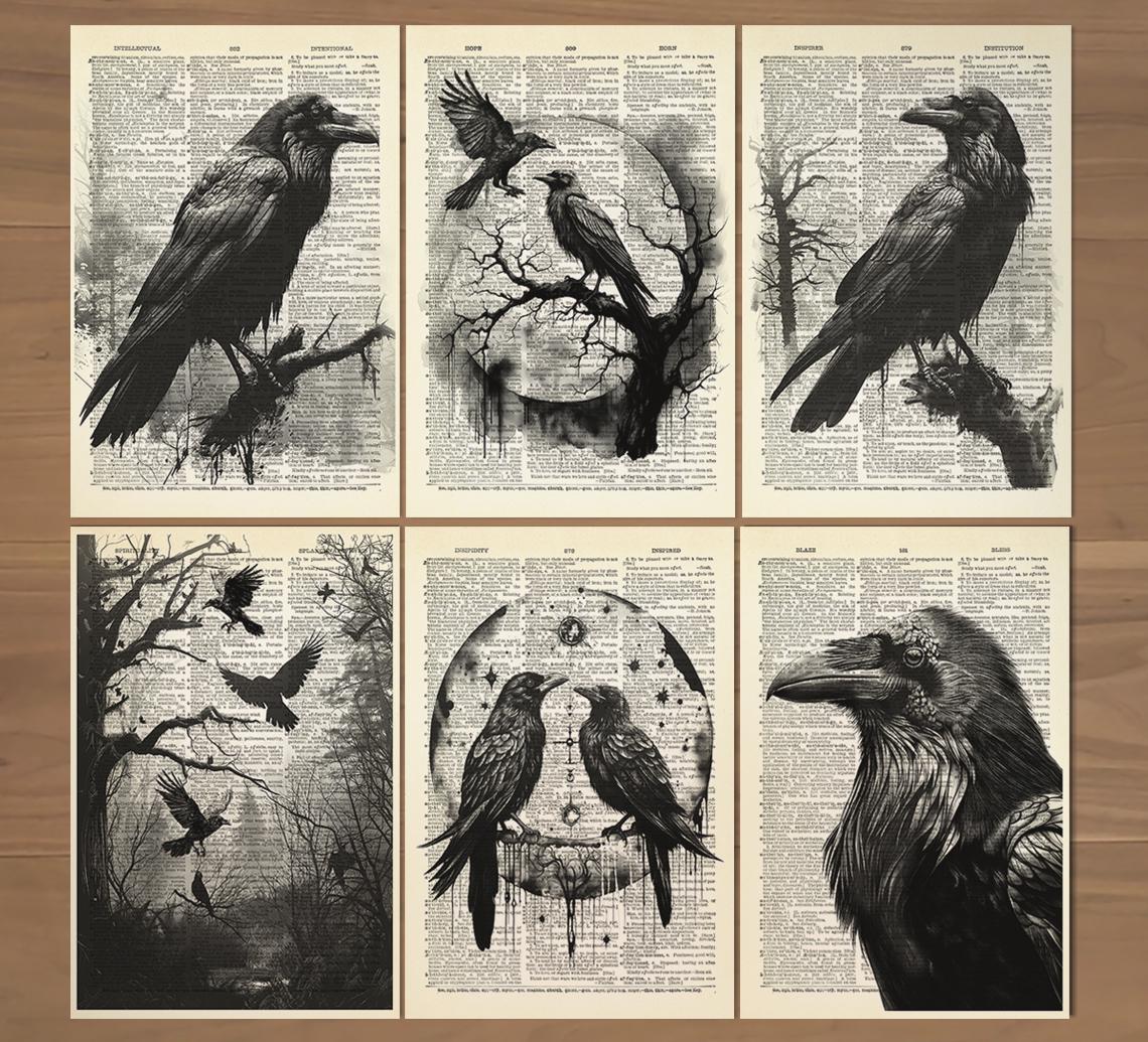 Raven Crow Print Set 6 Raven Wall Art Crow Poster Crow Wall Art Cro...