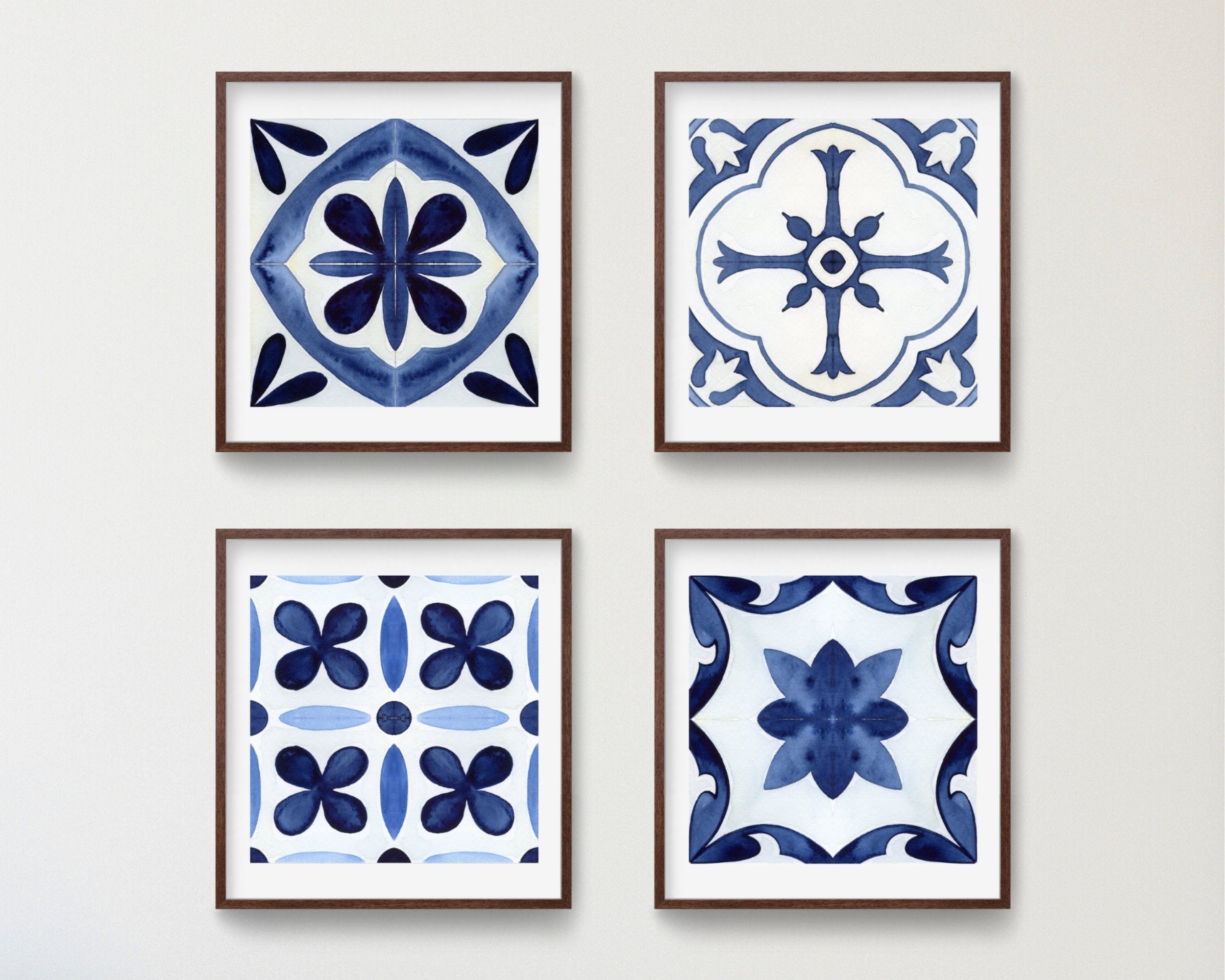Spanish Tile Wall Art, Set of 4 Watercolor Moroccan Tiles, Blue and...