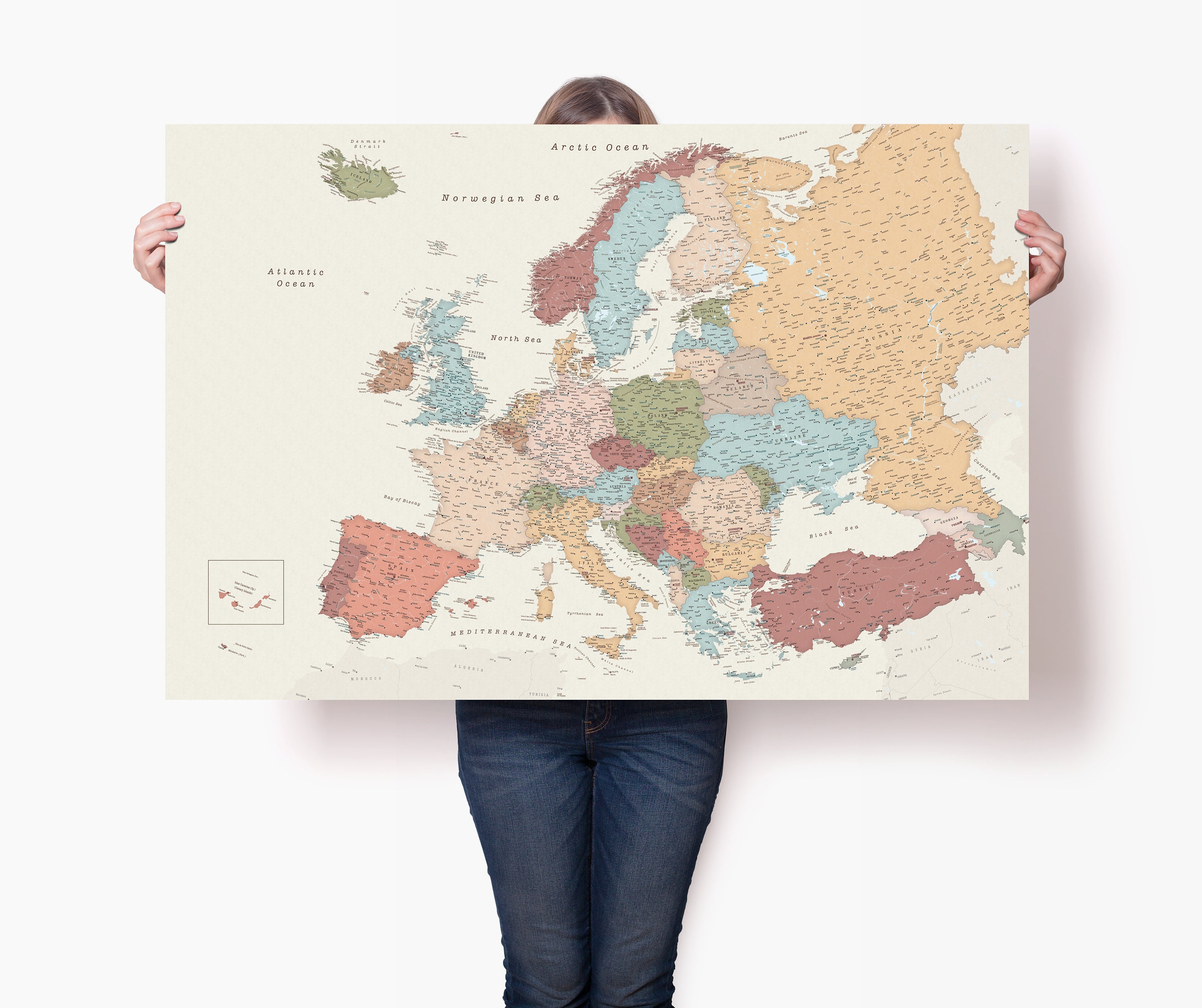 "Detailed Europe map poster wall art featuring European continent countries and thousands of ci...