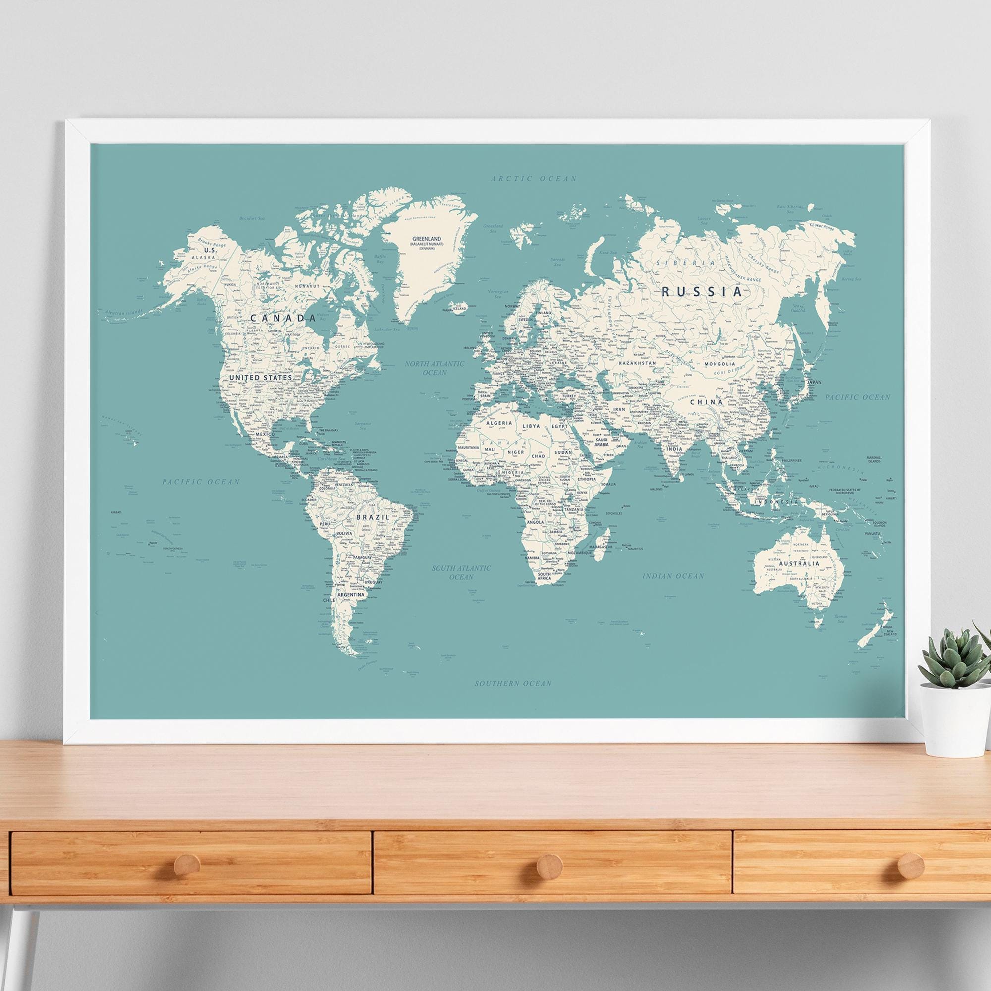 World map | Map of the World Extra large wall art | Blue and Beige ...