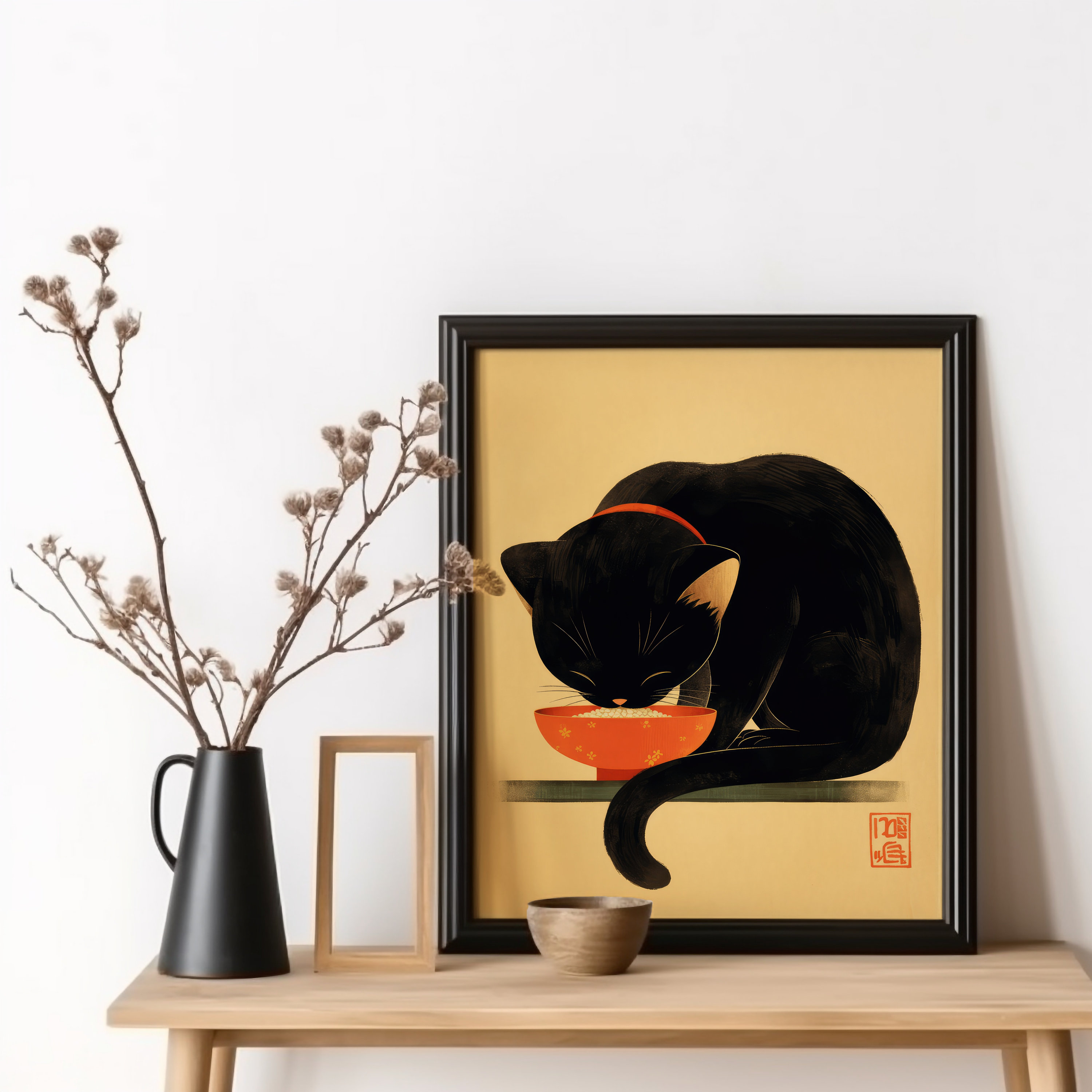 Bowl of Rice Cat Art, Tokyo Black Cat Rice Art Print, Japanese Food...