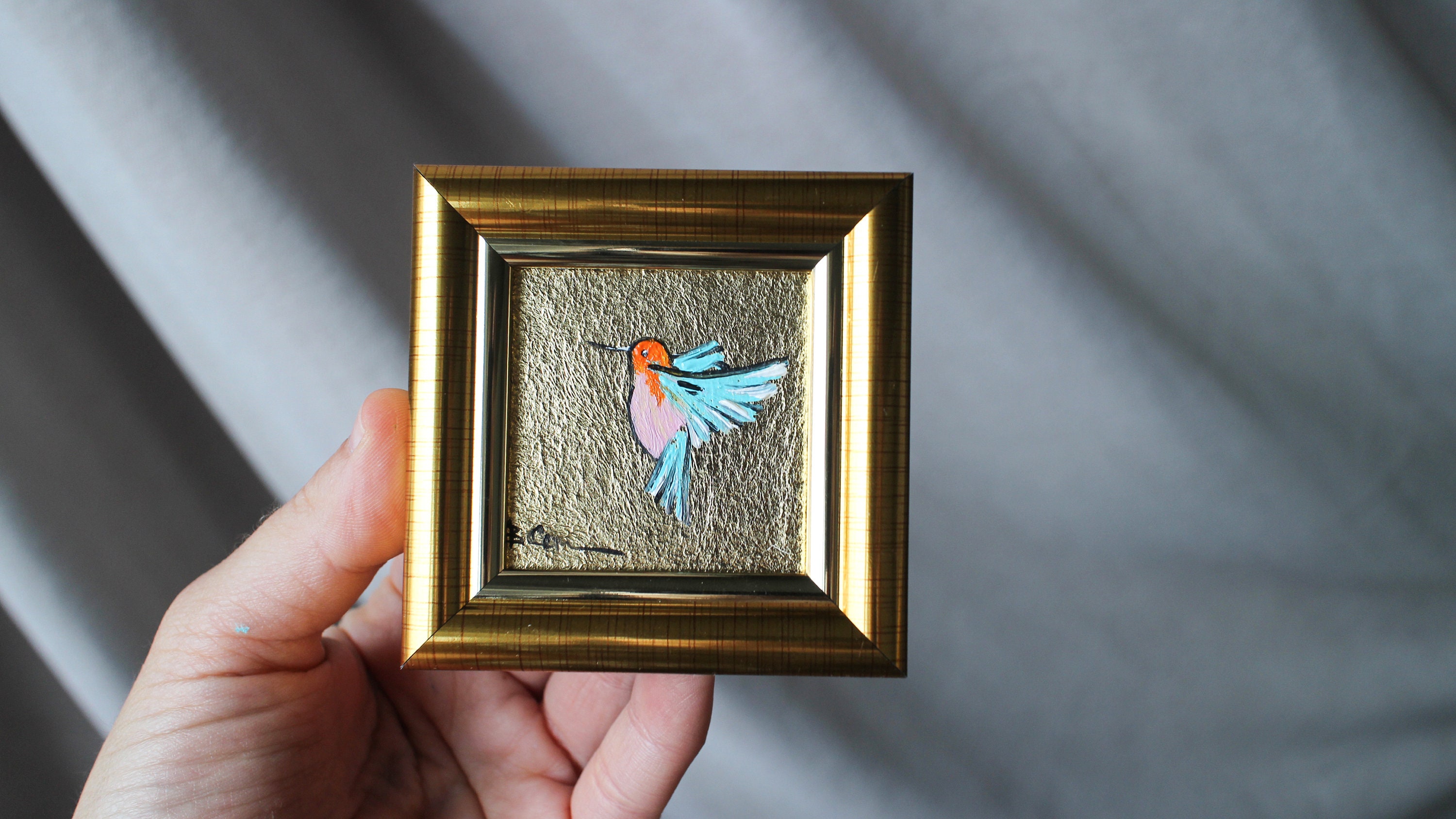 Hummingbird miniature original oil Painting with gold leaf with gold frame Size 5х5cm \ 2*2 in...