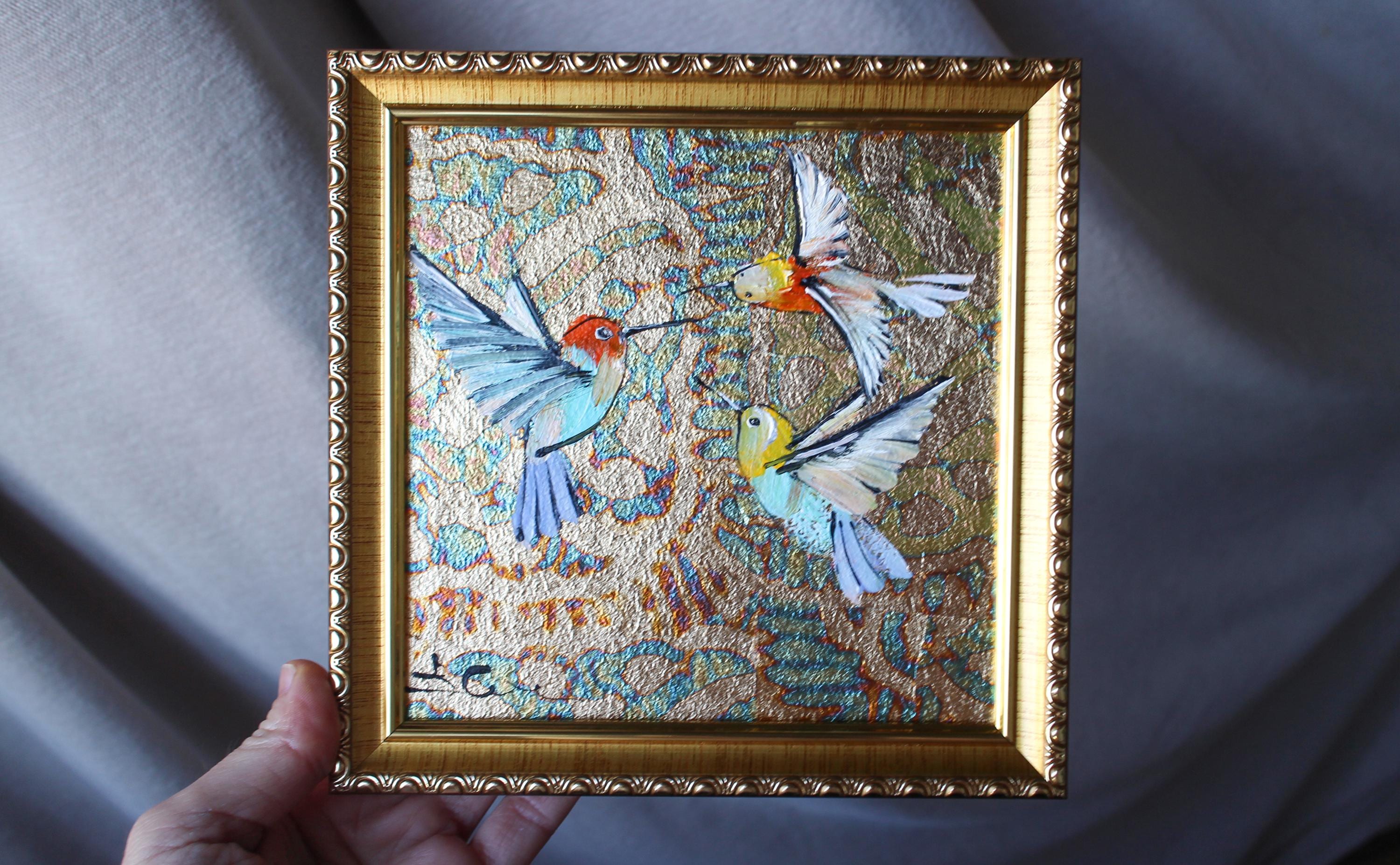 Hummingbirds Colibri oil Painting with gold gold leaf framed 6x6 go...