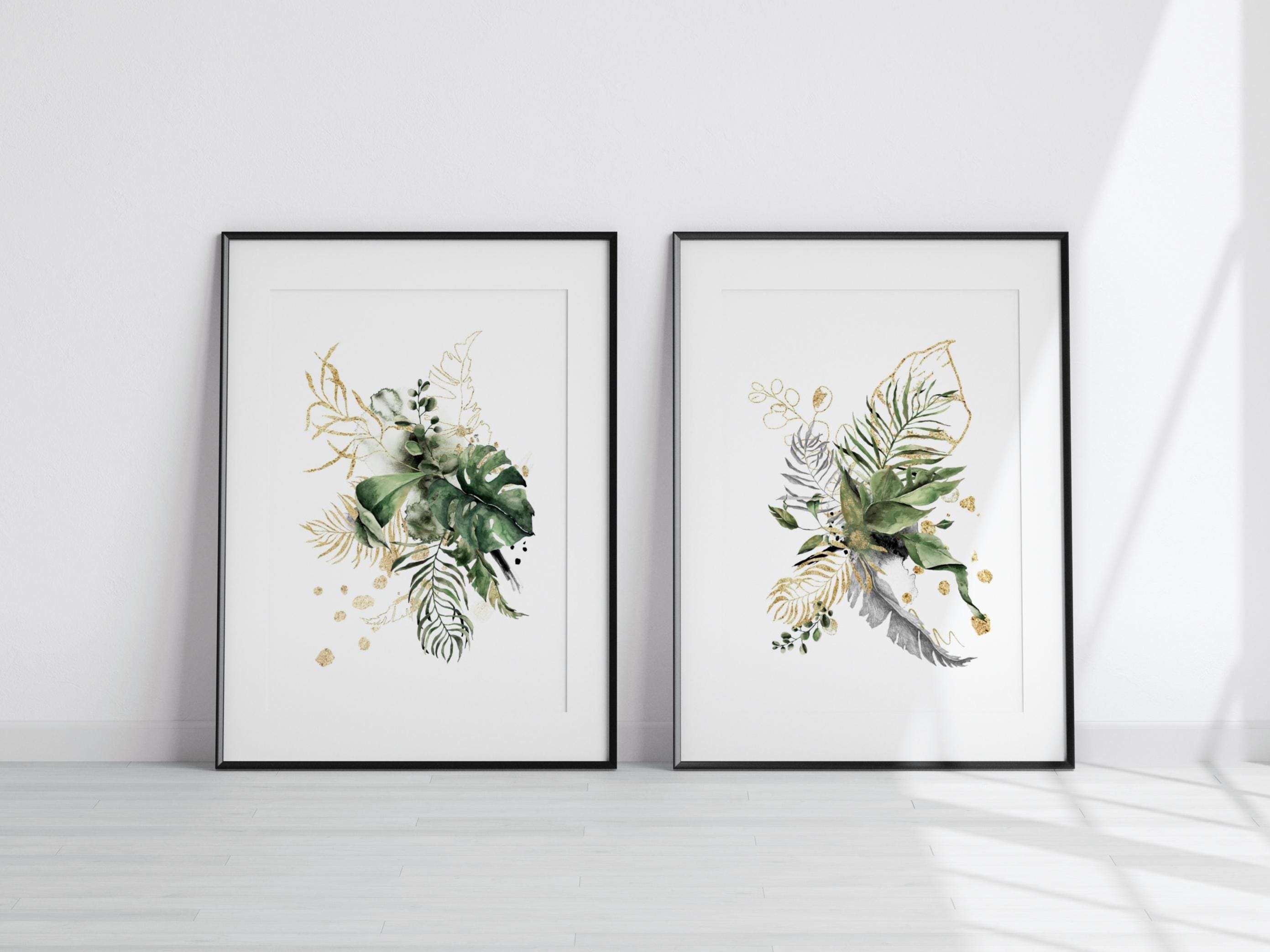 Green and Gold Leaf Prints, Leaves with gold splash, Tropical Leaf Wall Art, Modern Botanical Prints...