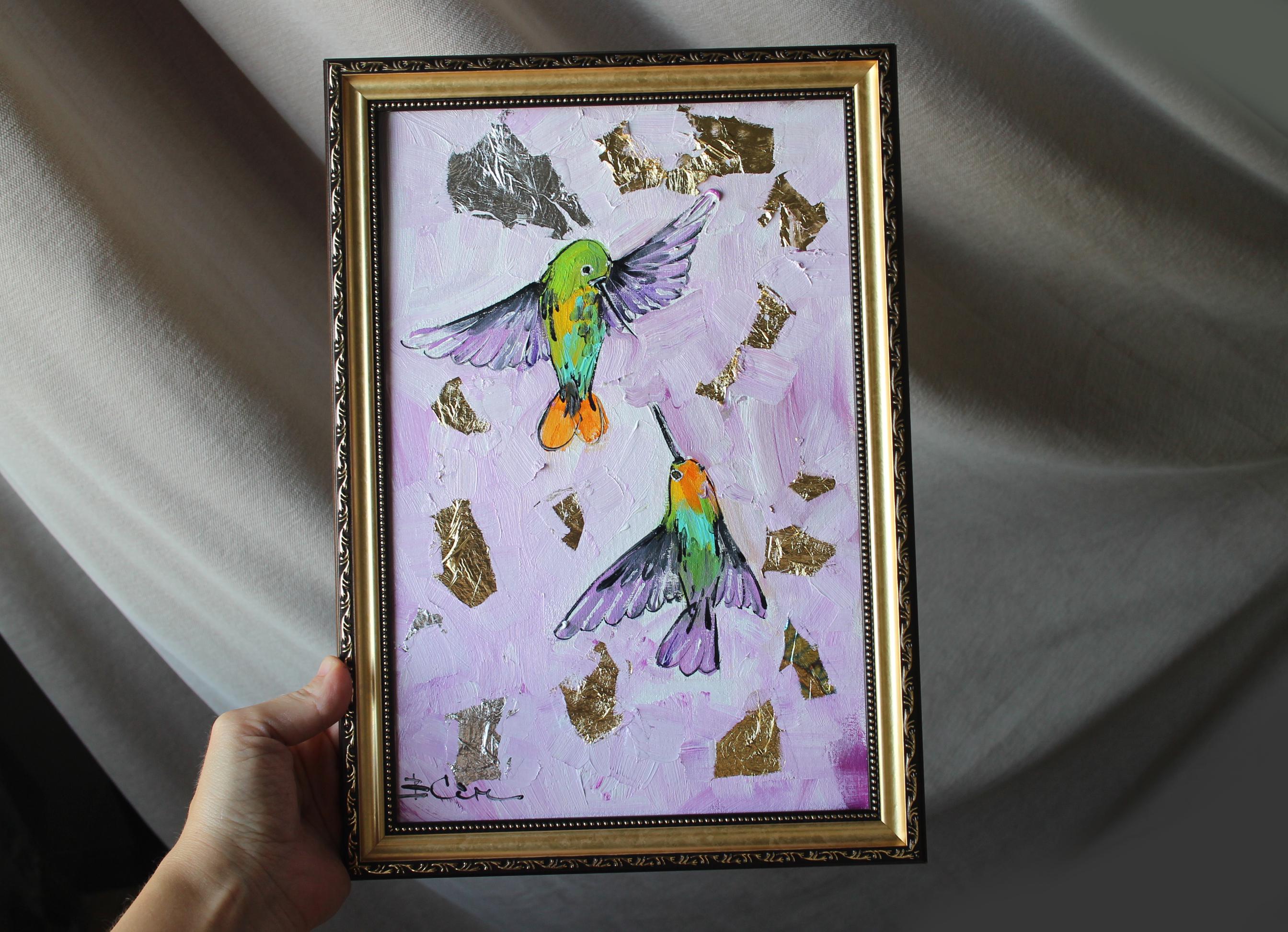 Hummingbird original oil Painting with gold leaf fremed Size 30x20cm \ 8x12in Oil on canvas Original...