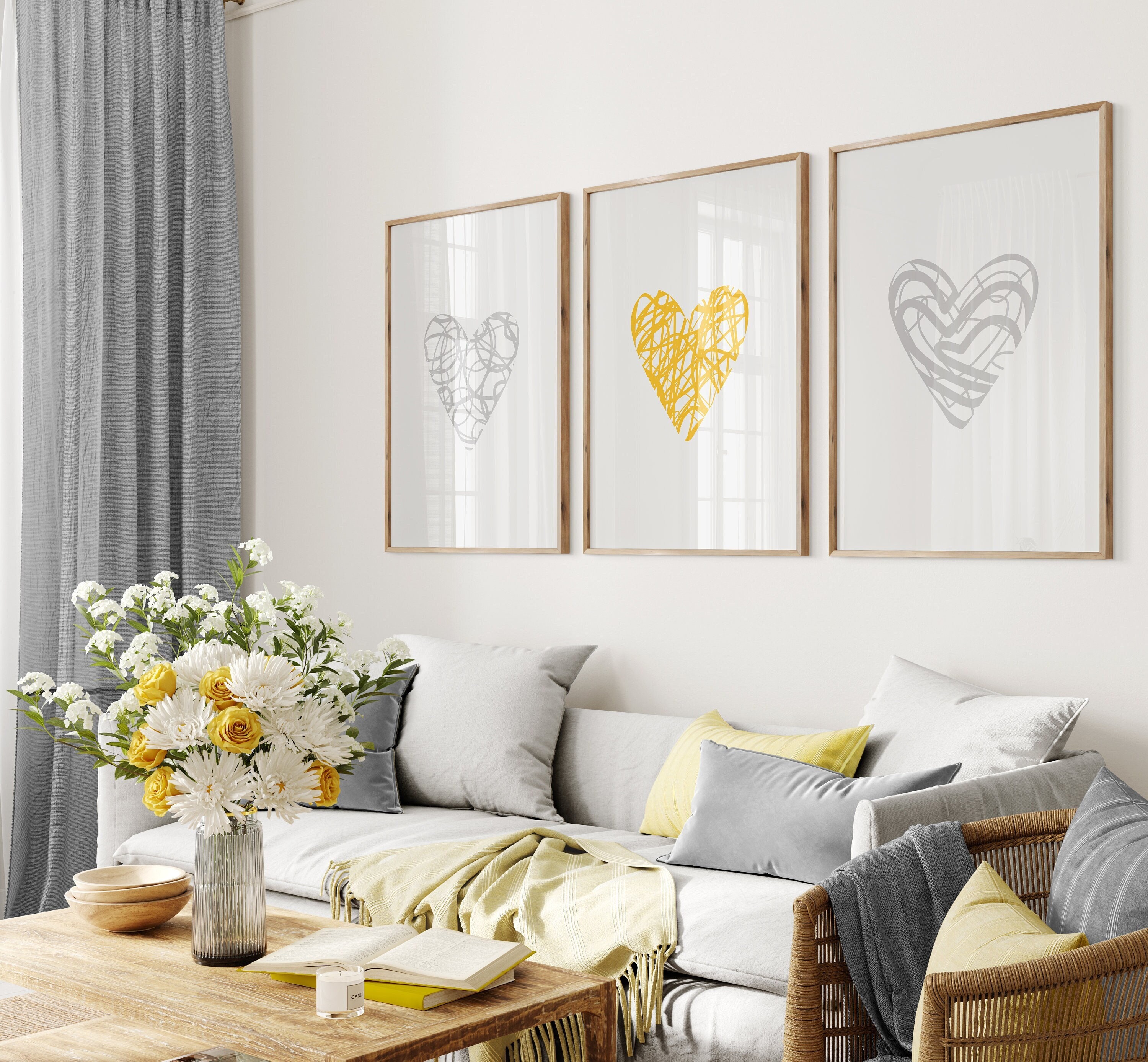 "Set of 3 yellow & grey scribble love heart wall art prints on a soft grey background, prin...