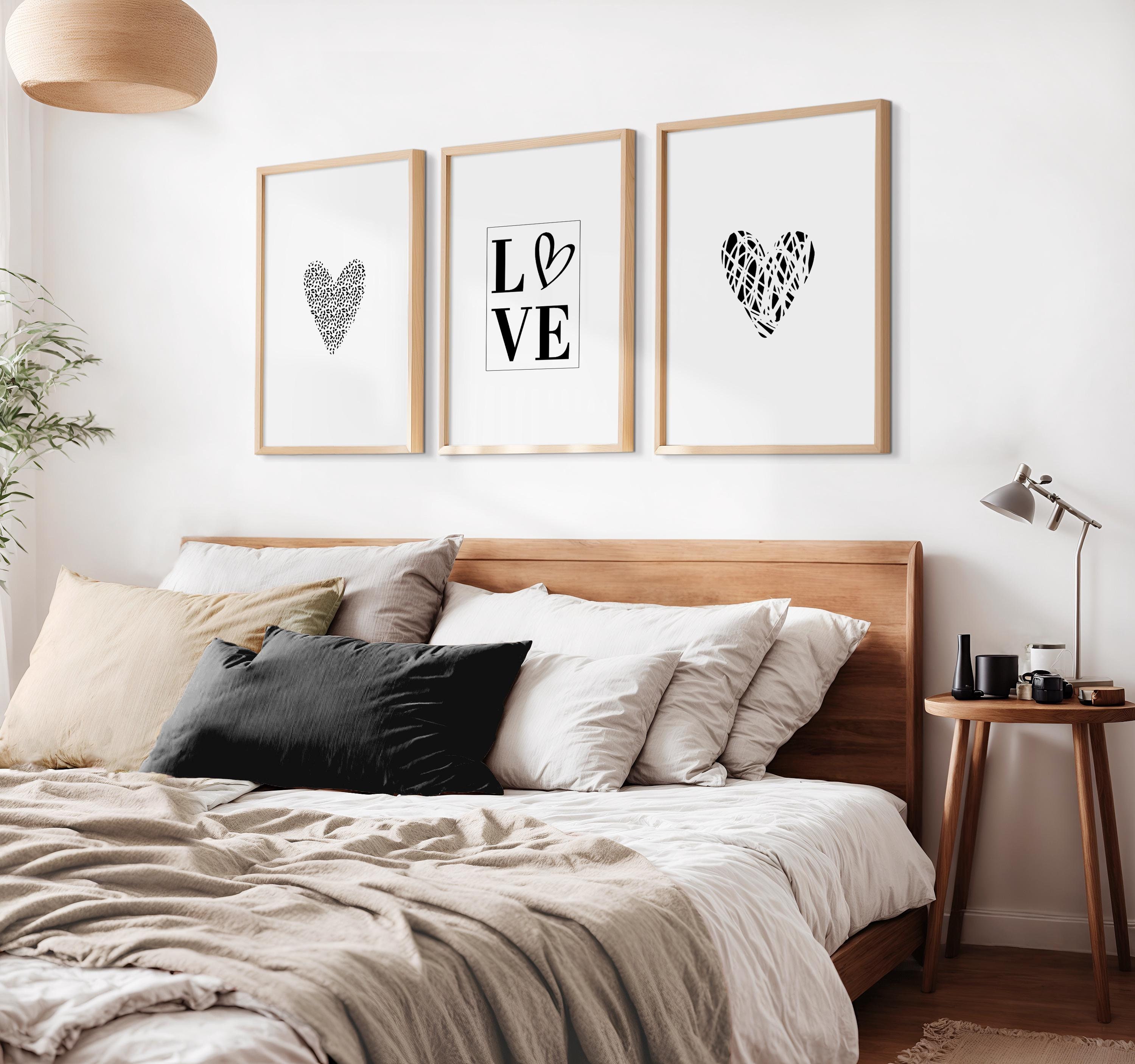 "Set of 3 black & white love heart bedroom wall art prints, in minimalist style these scrib...