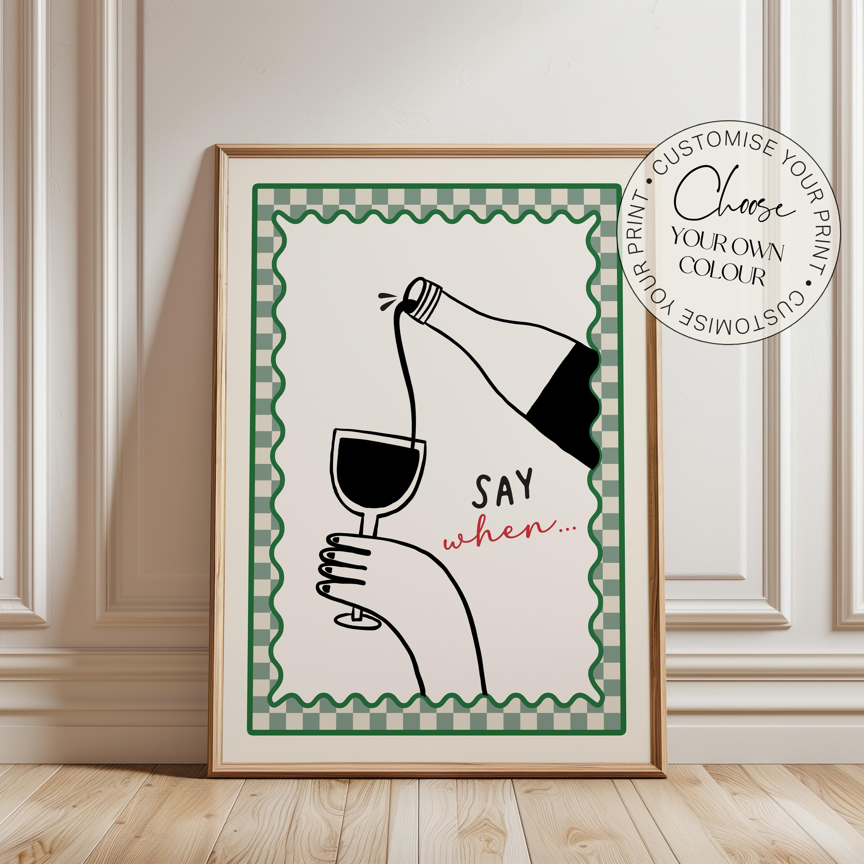 "Kitchen print. Wine wall art, 'Say when' funky kitchen Print, available in 8 colours, featurin...