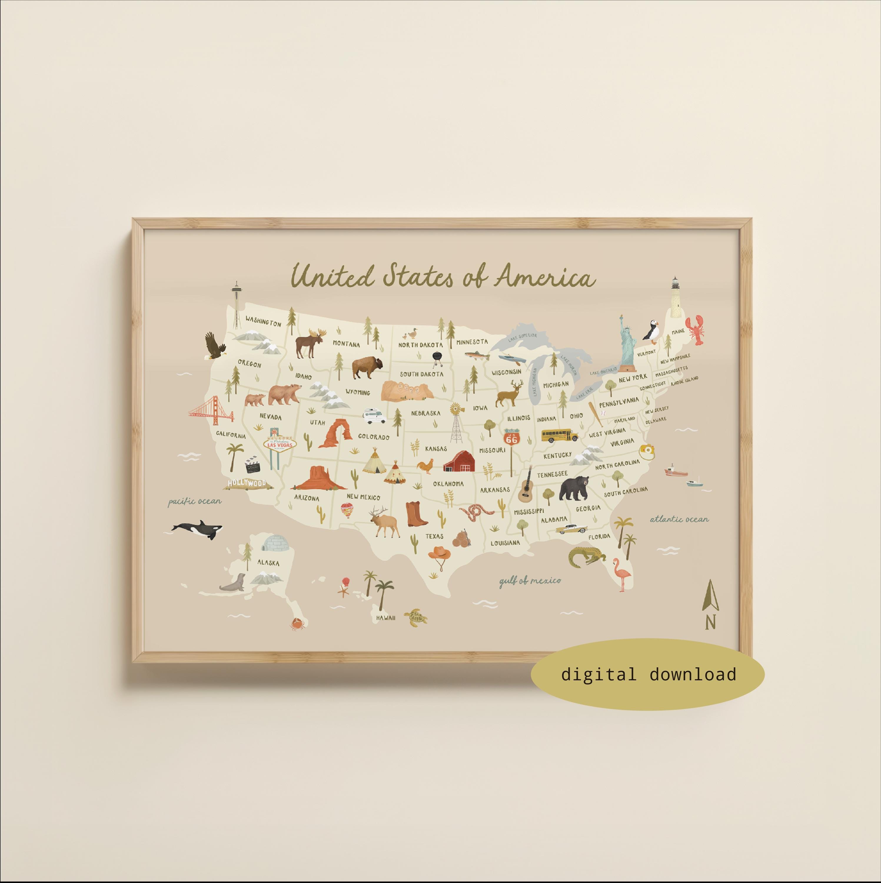 This beautifully illustrated map of the Unites States of America is filled with fun landmarks and ic...
