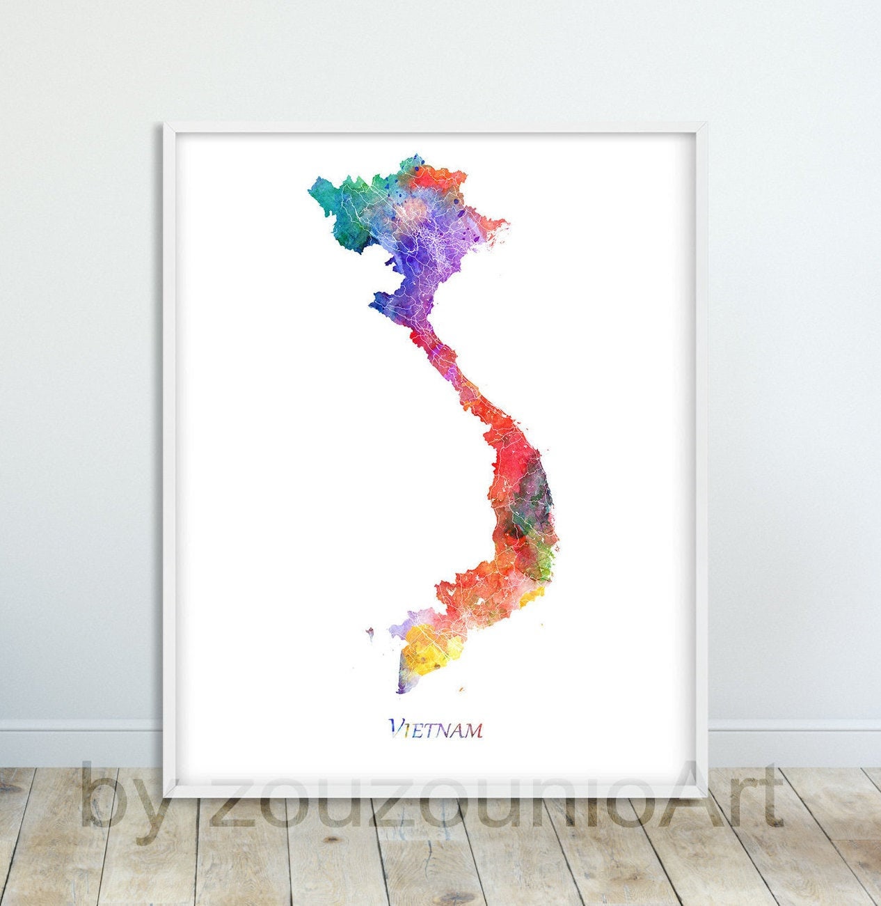 Vietnam Map Art Print, Vietnam Map Watercolor Art Poster, Vietnam M...