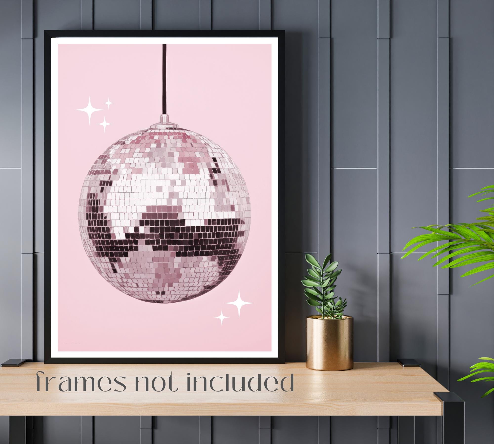 Retro Disco Ball Poster, Pink Mirror Ball Wall Art, Vintage 70's St...