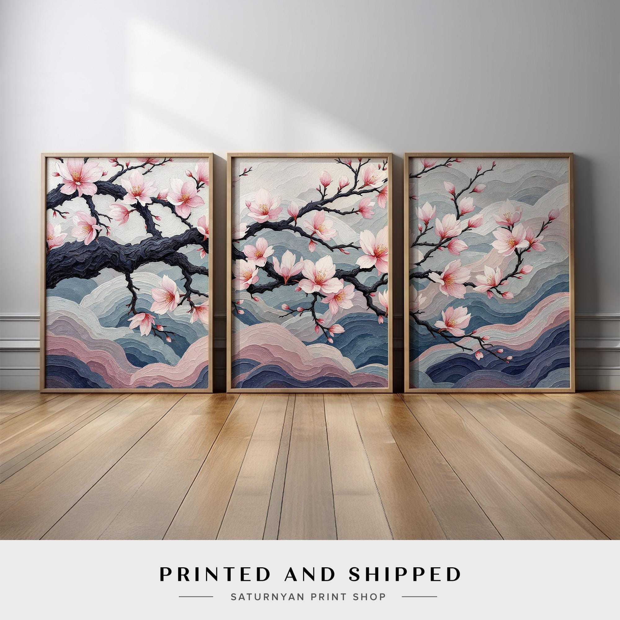 Japanese Cherry Blossom Wall Art Set, Sakura Tree Wall Decor, Elega...