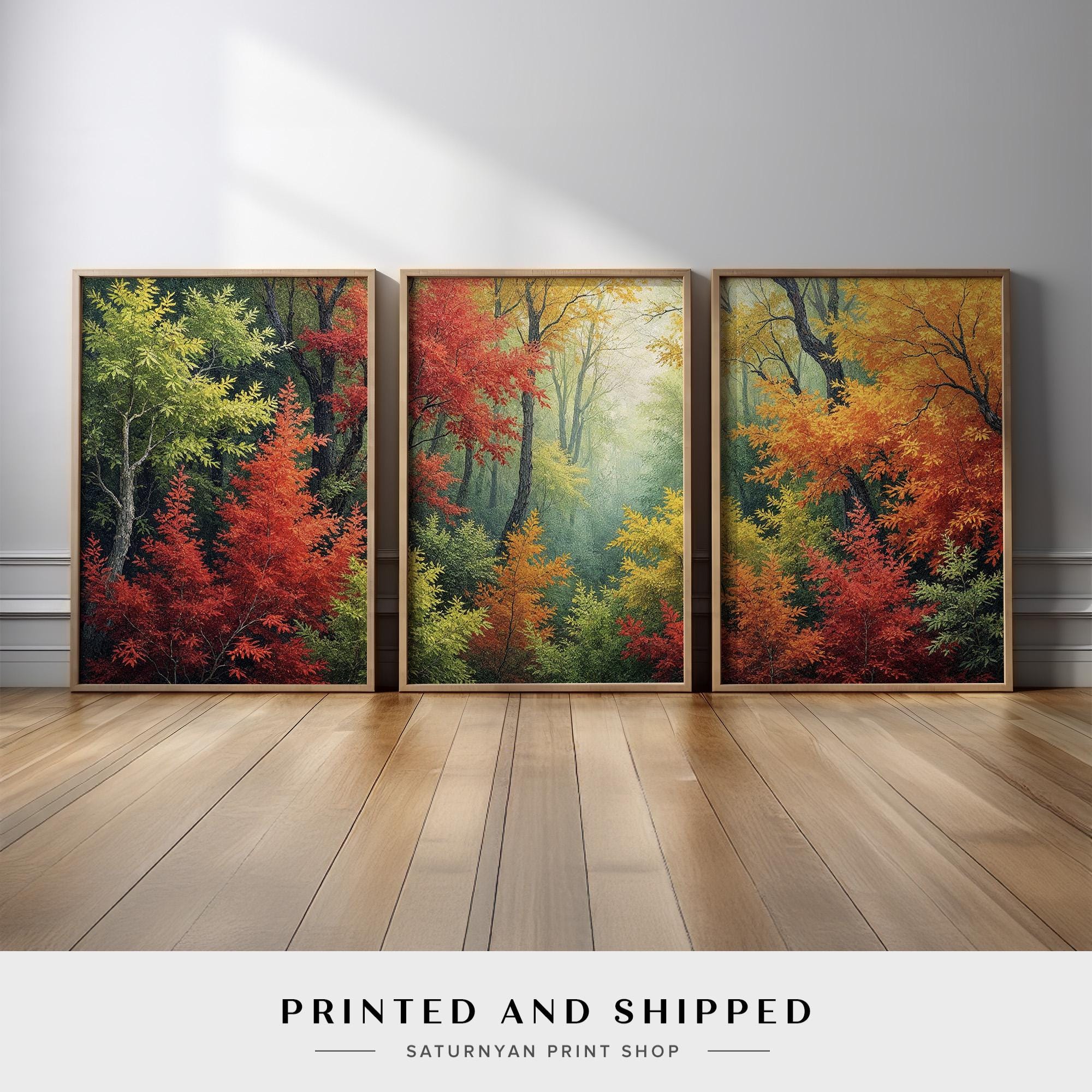 Autumn Forest Wall Art | Set of 3 Vibrant Red, Orange, and Green Tr...