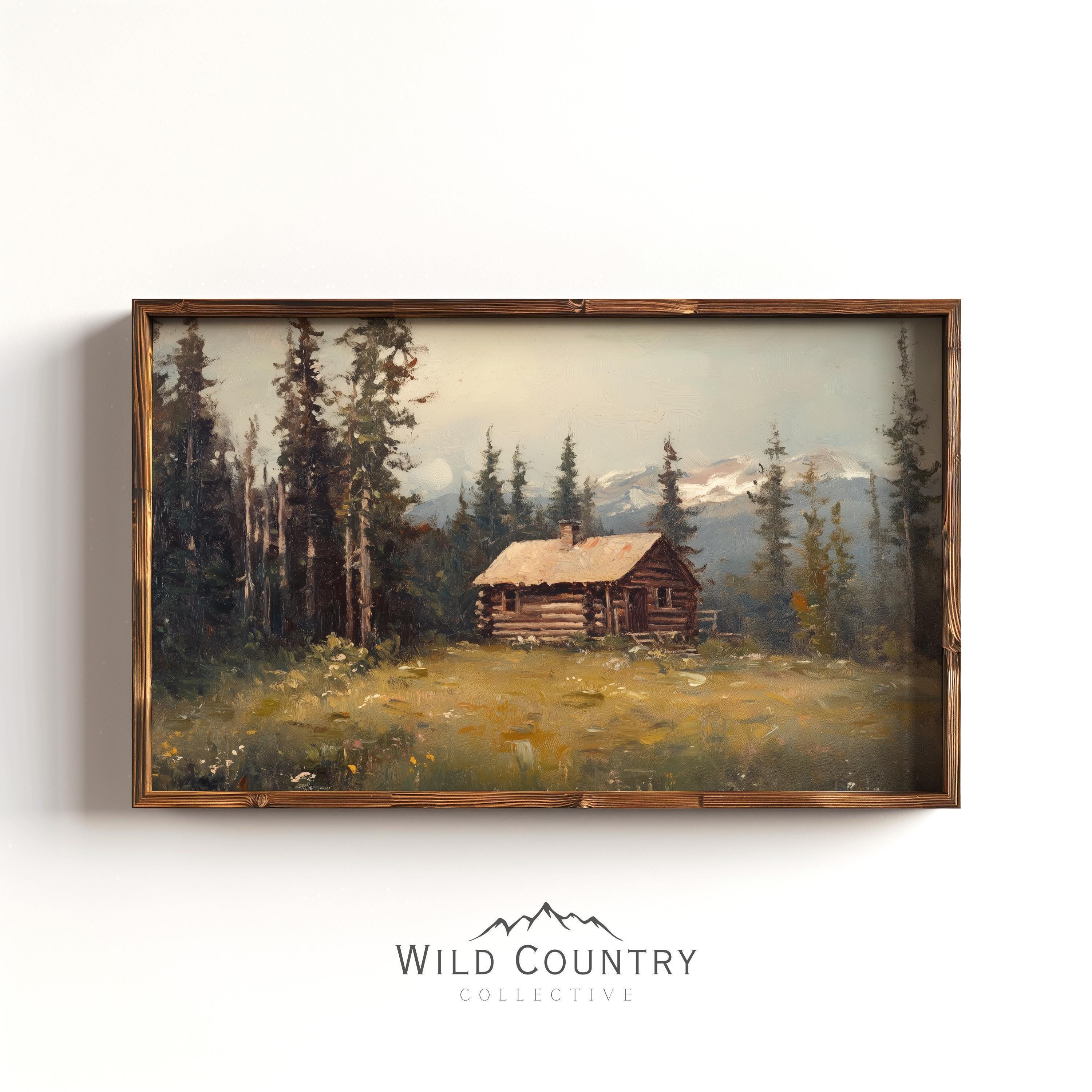 "Made to reflect Rollins, Montana, this log cabin painting features a quaint cabin in the surro...