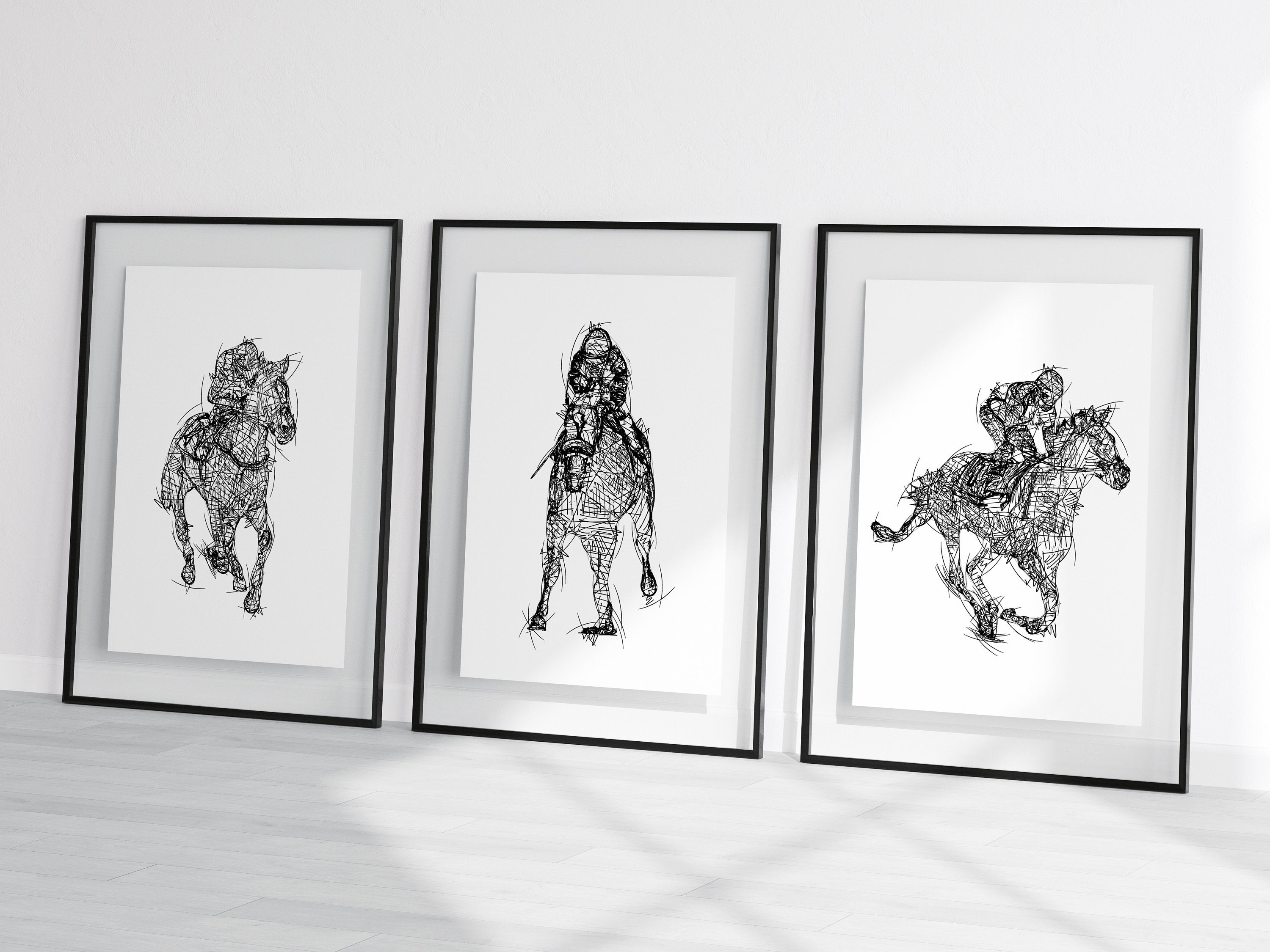 This listing is for a SET OF 3 PCS of HORSE RACING Sketch Style designed prints. Our set of prints a...