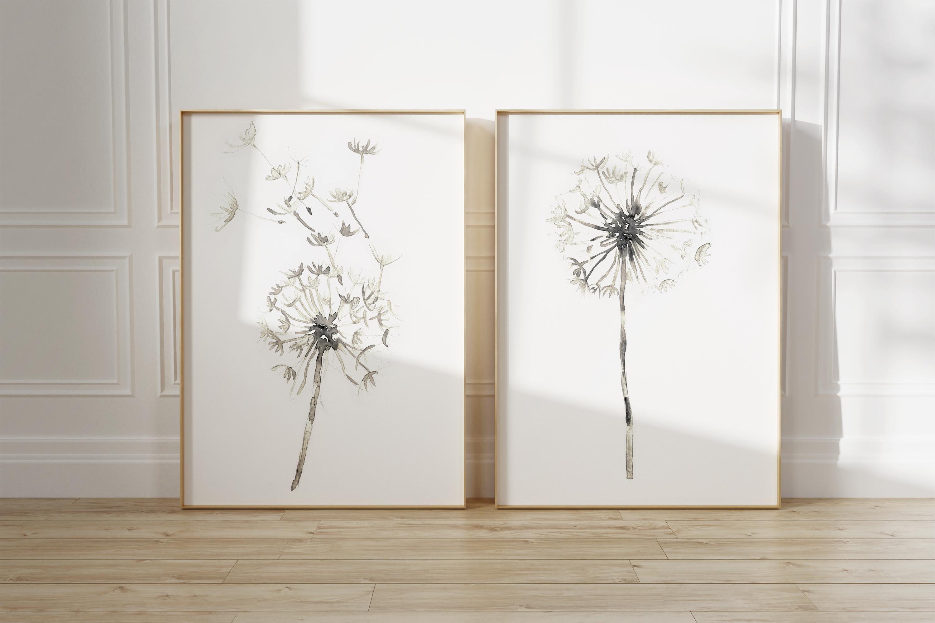 Set of 2 dandelion flowers Watercolor Painting buds Abstract Shabby...