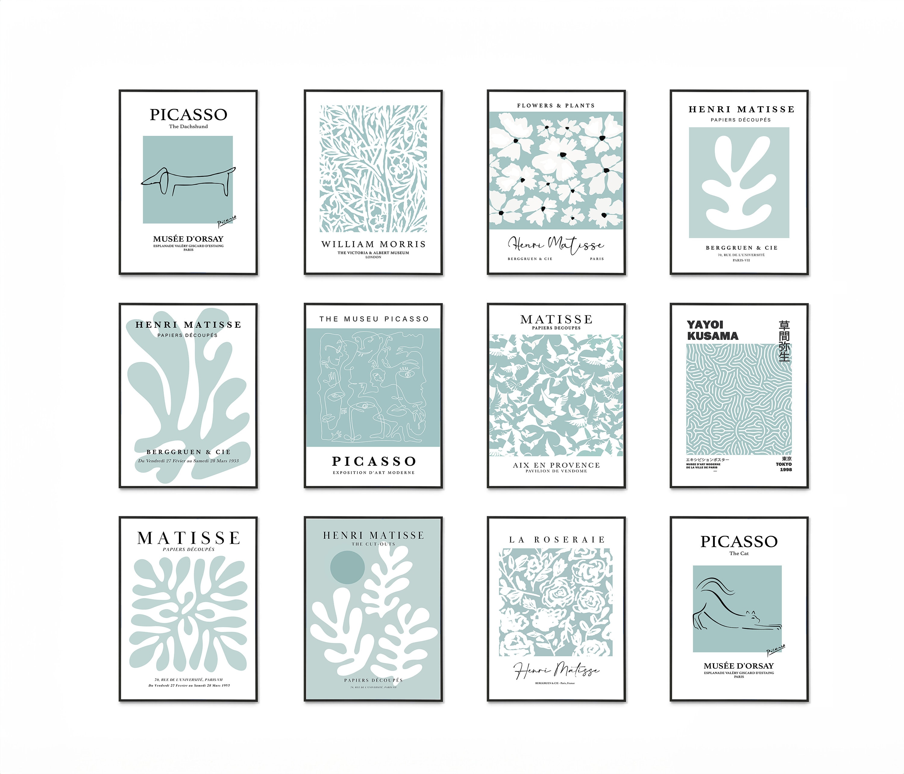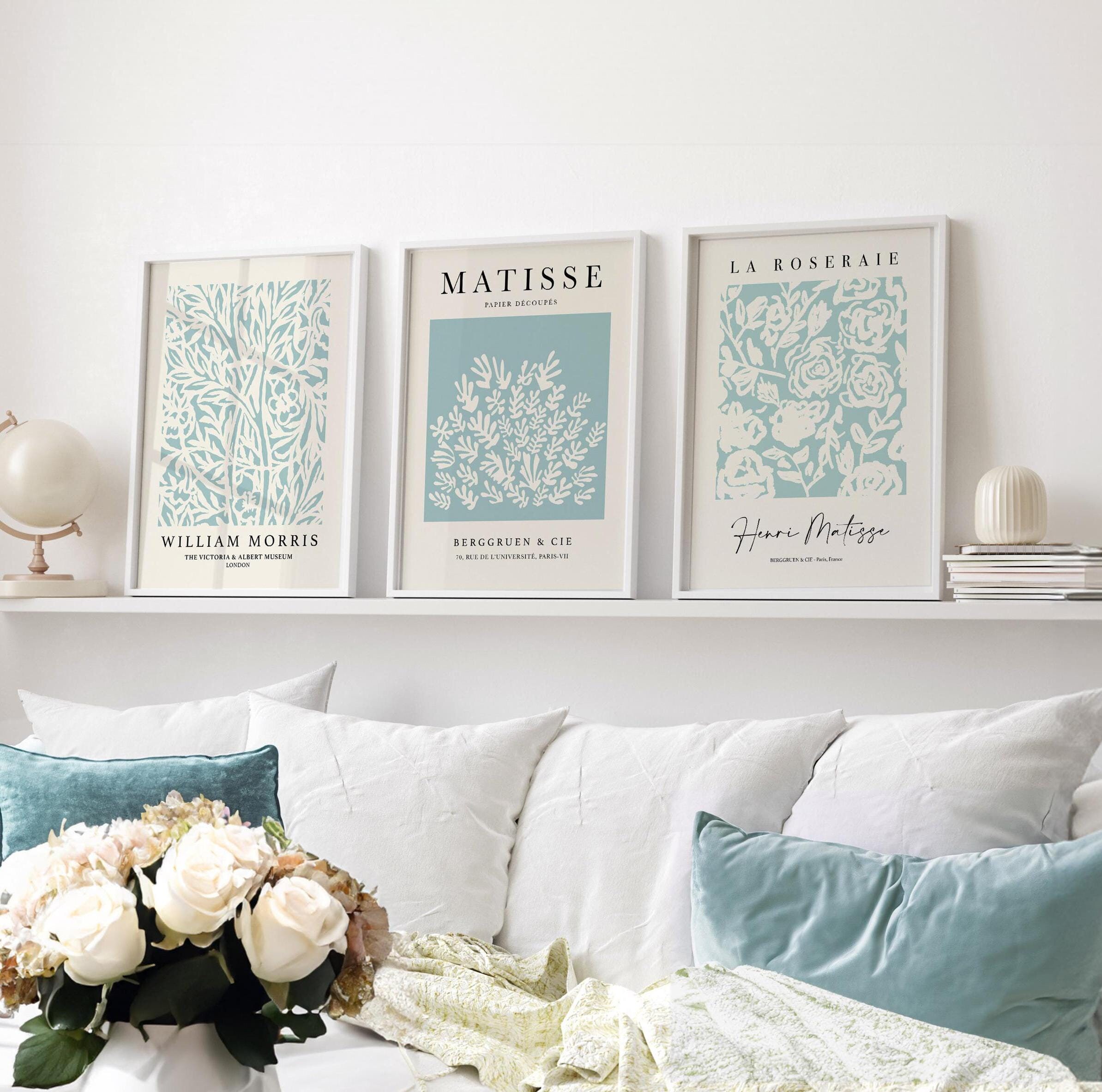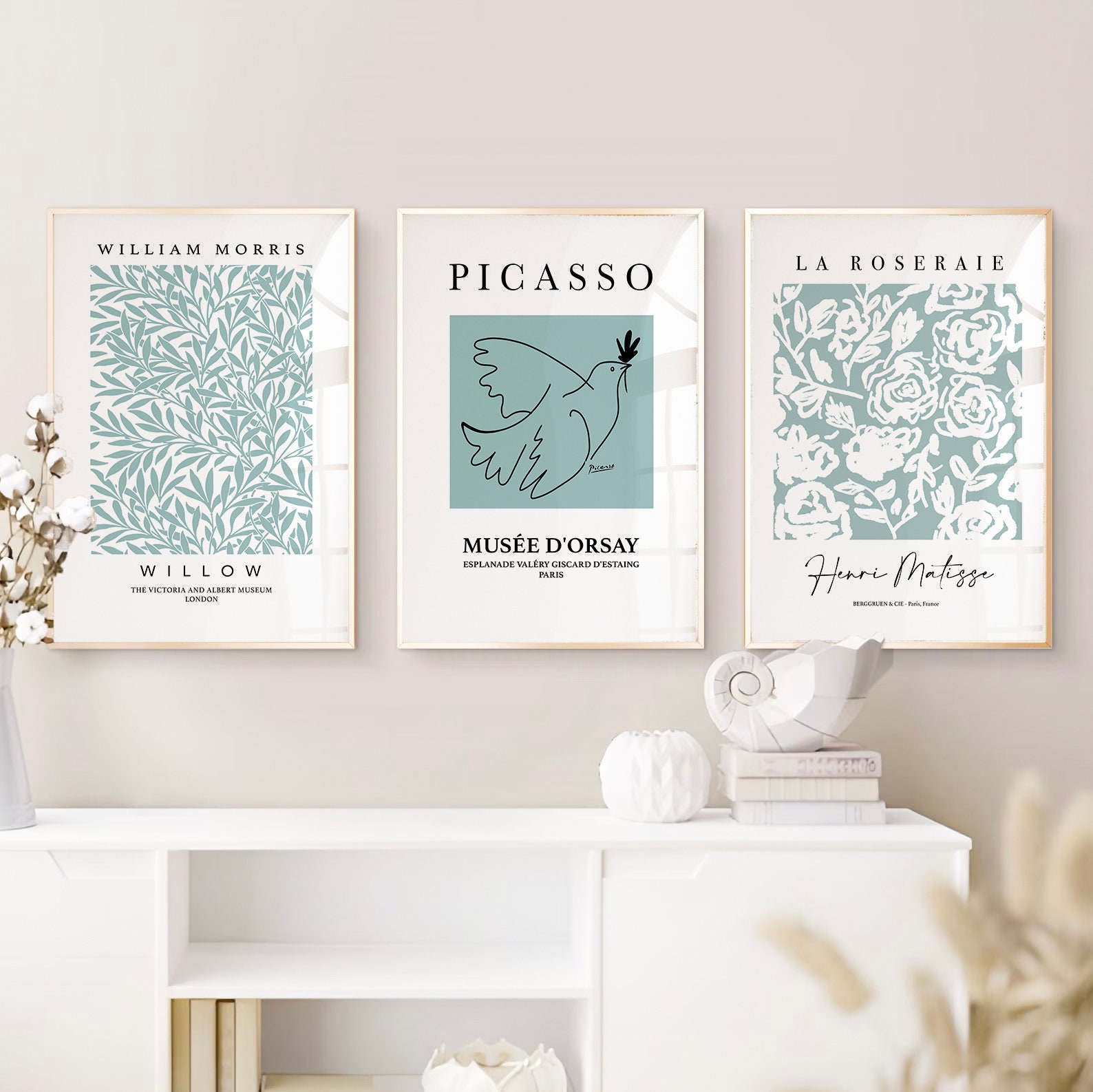"Set of Three Teal Blue and White Modern Art Prints; featuring William Morris, Pablo Picasso an...