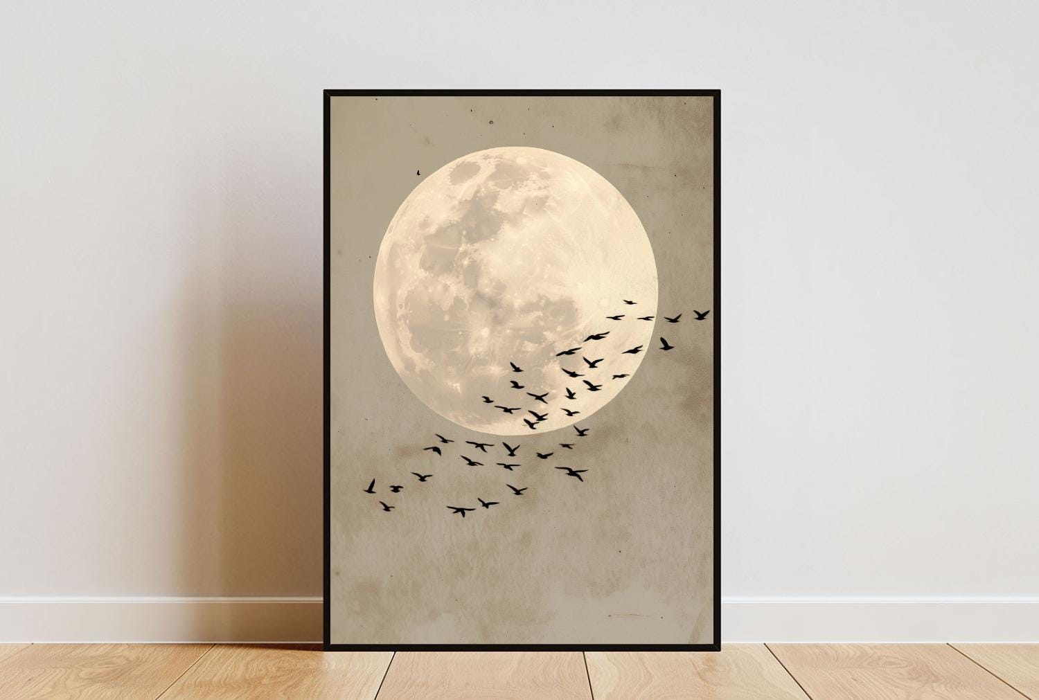 Beige Moon Poster, Moon Wall Art, Birds Poster, Beige Moon Print, M...