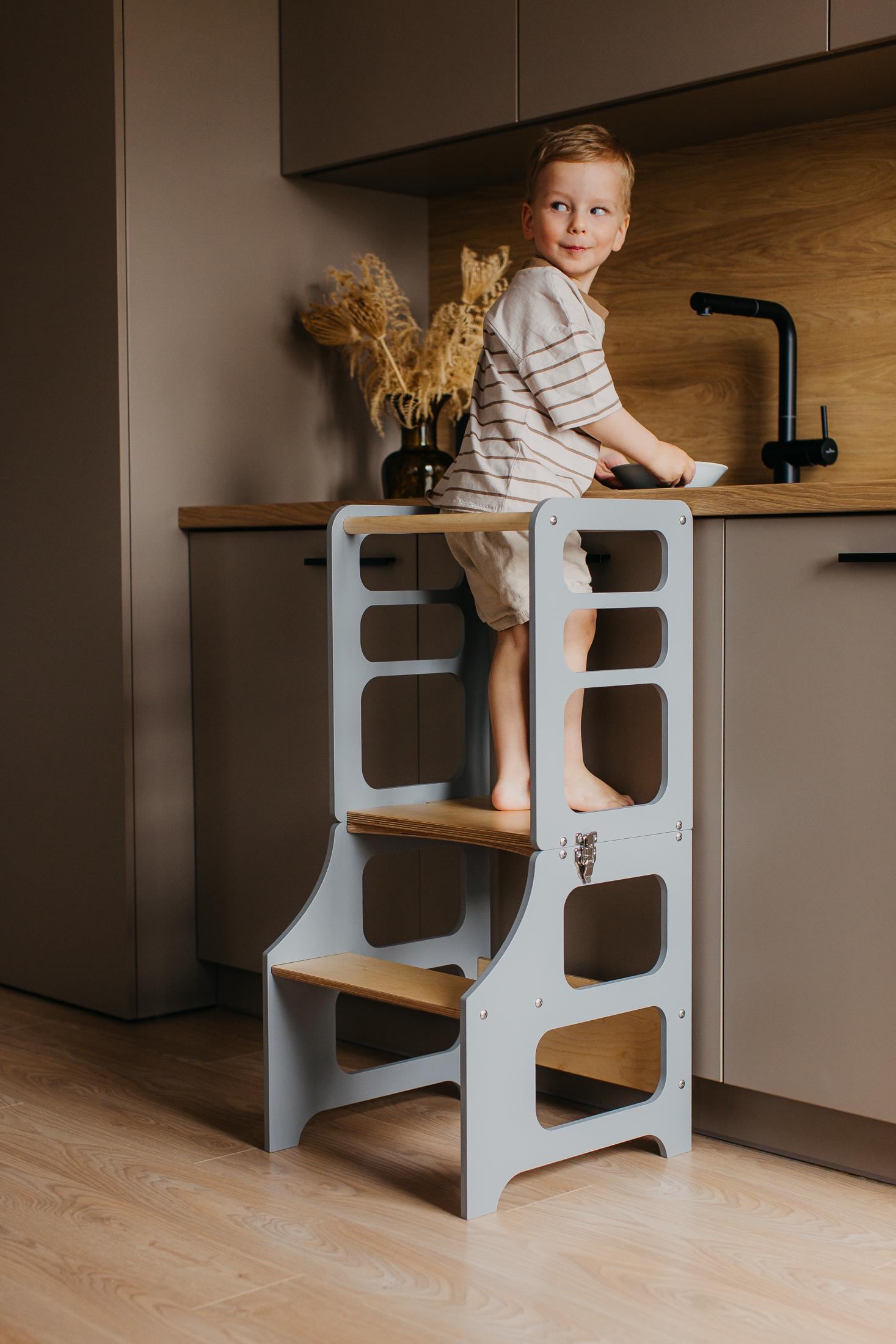 "FOLDABLE KITCHEN TOWER WITH SLIDE The kitchen tower comes in handy for a child's everyday task...