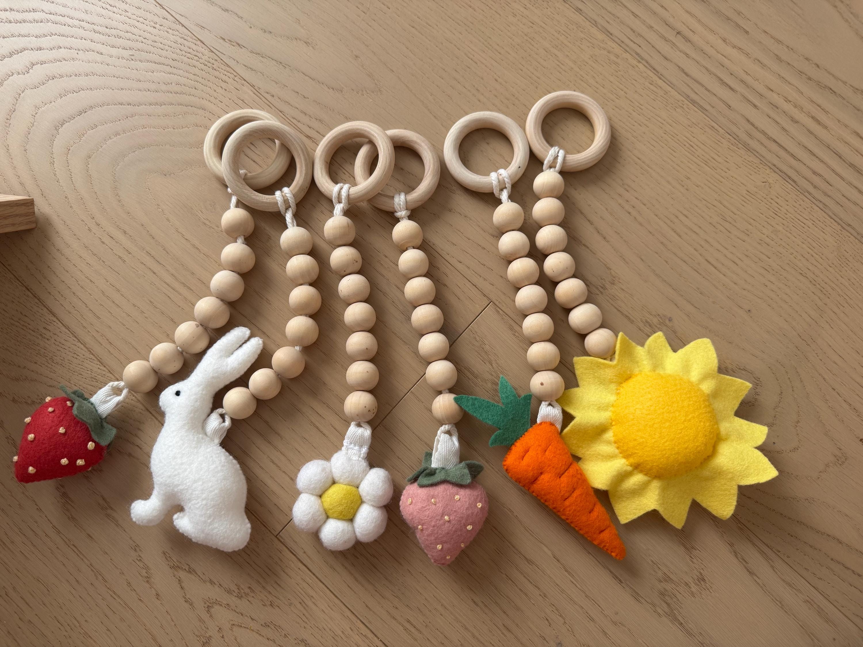 Materials: Felt, wood, hollowfiber filler Description This baby gym hanging toy: is perfect for a ba...