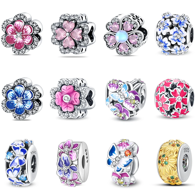 S925 Sterling Silver Plum Blossoms Azaleas Sunflowers Cherry Blosso...