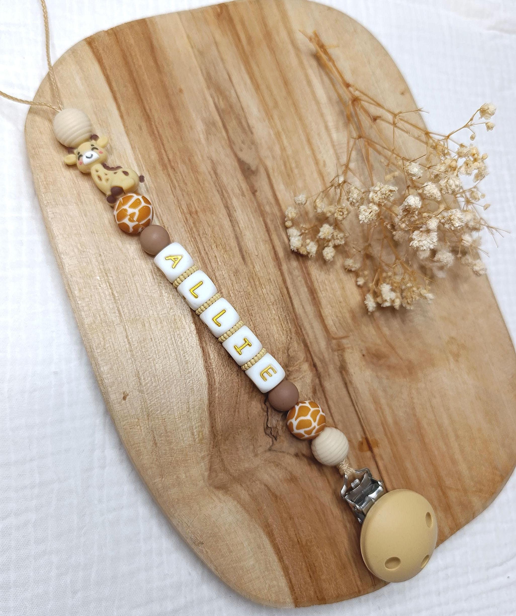 Giraffe savannah pacifier clip with golden letters - customizable g...