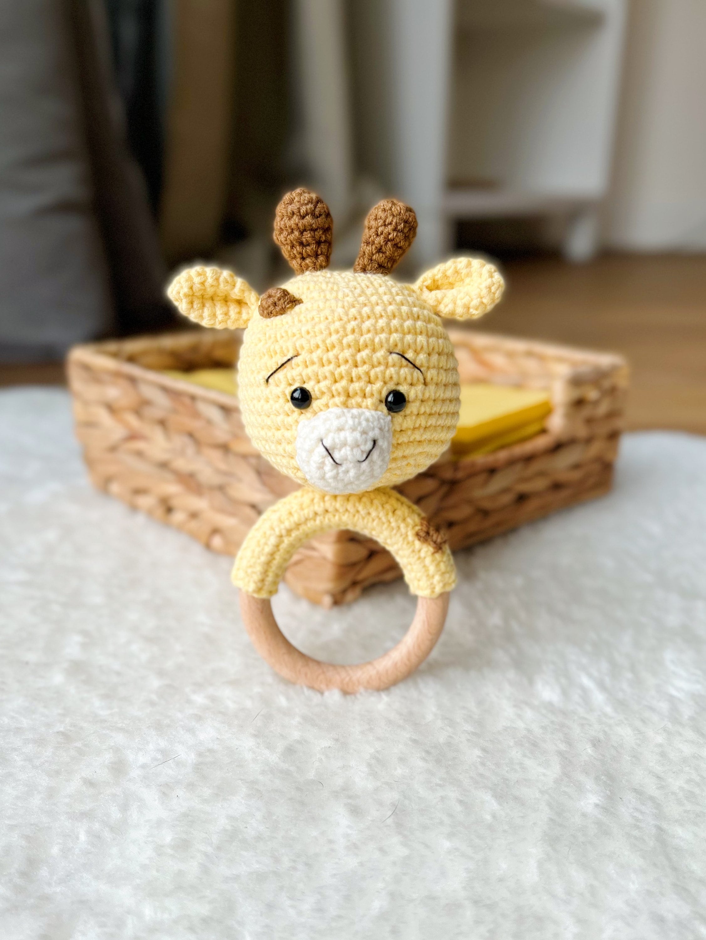 This lovely crochet Giraffe baby rattle on a natural wooden ring is a perfect gift for new or small ...