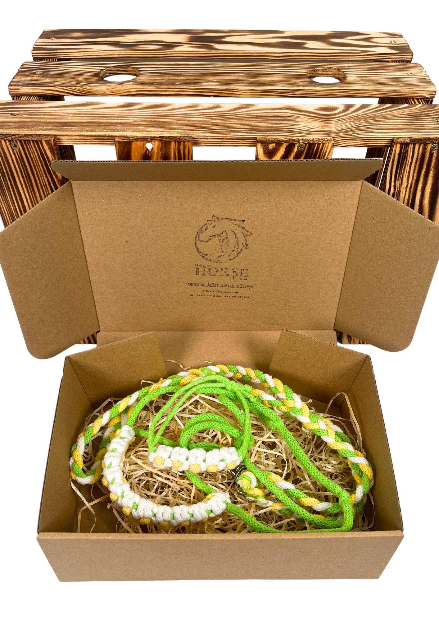 Selling a new, lovingly handcrafted hobby horse halter in green with mint-colored checkered webbing/...