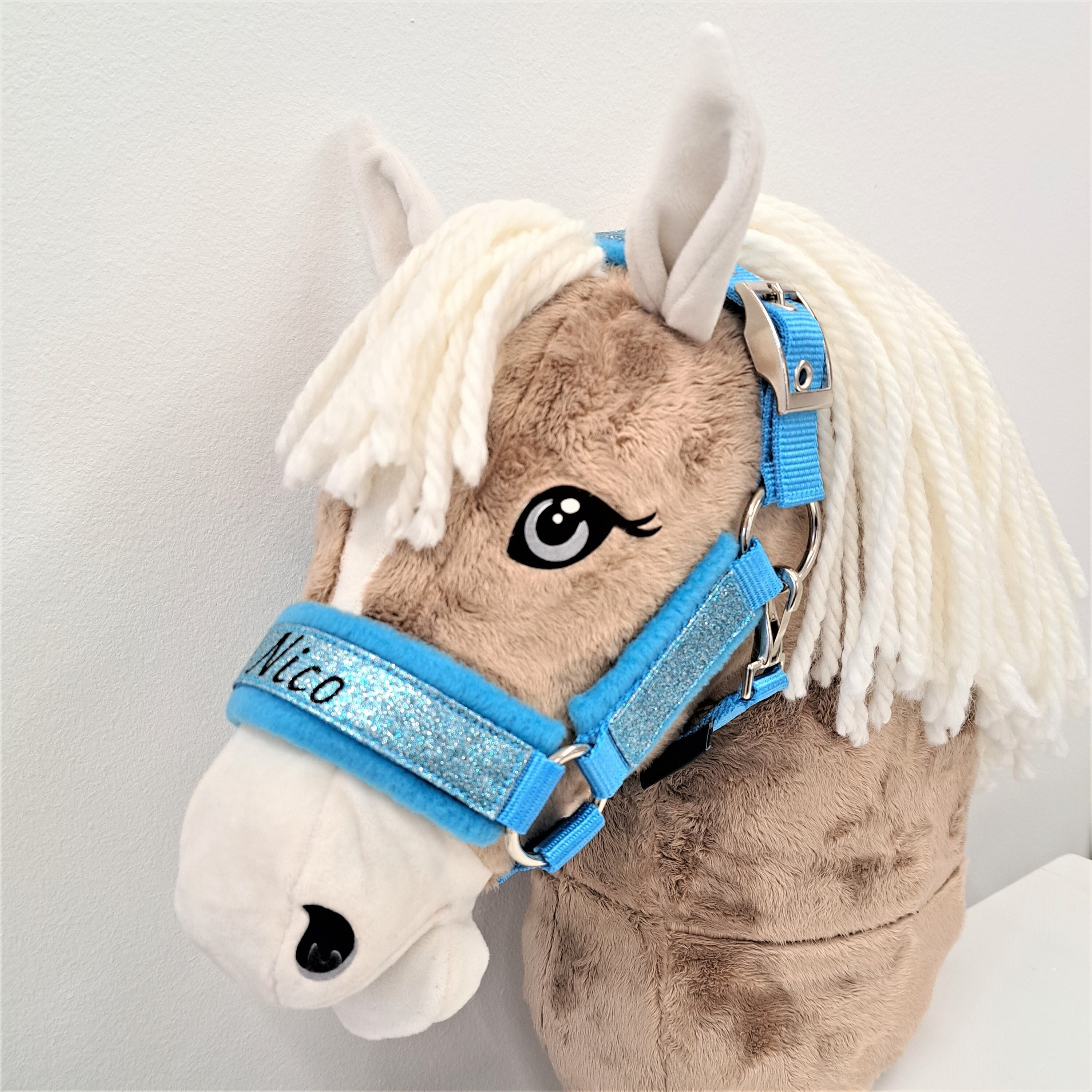 The very special halter for your hobby horse Sparkling in light blue with silver-tone fittings. Pers...
