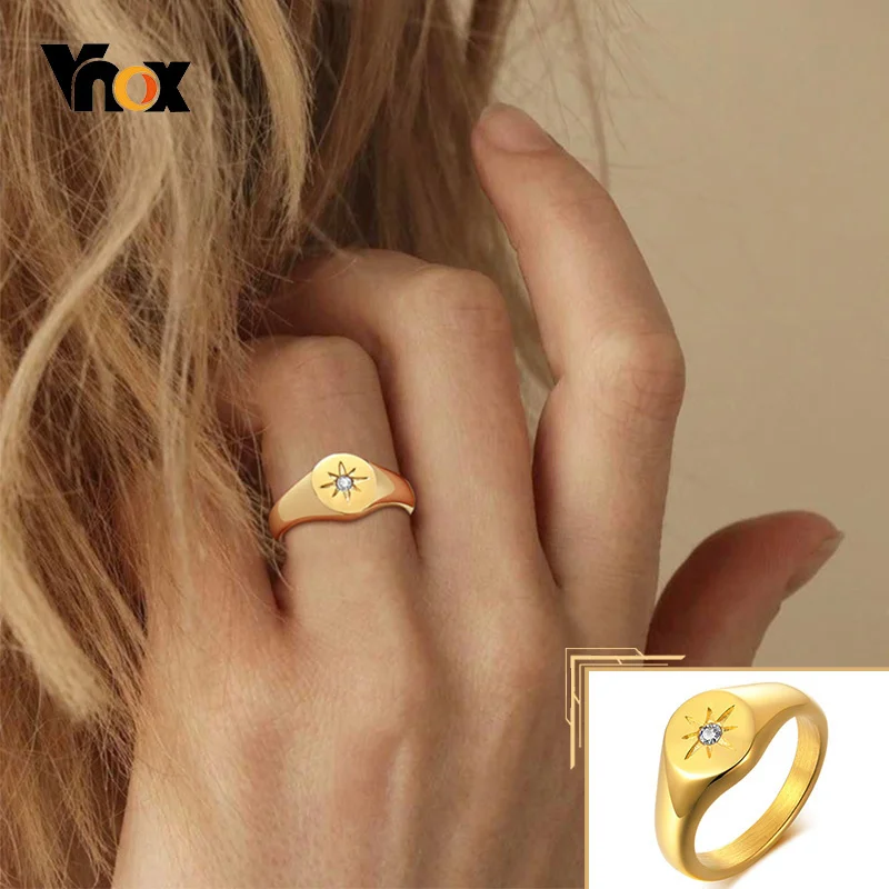 Vnox Star Stamp Ring for Women, Gold Color Stainless Steel Signet Round Top Ring with AAA CZ Stone, ...
