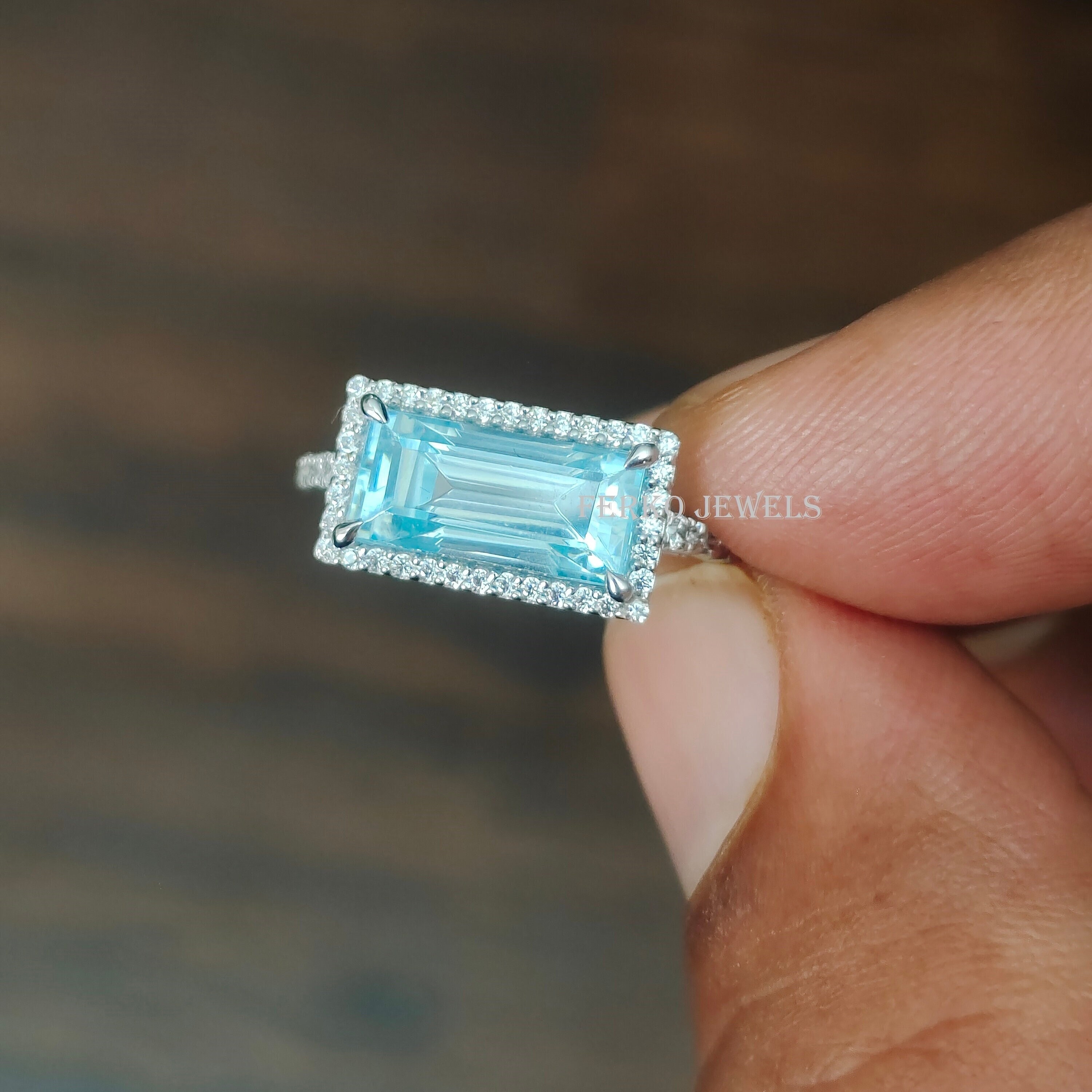 East West Emerald Cut Colored Stone Ring/East West Aquamarine Halo ...