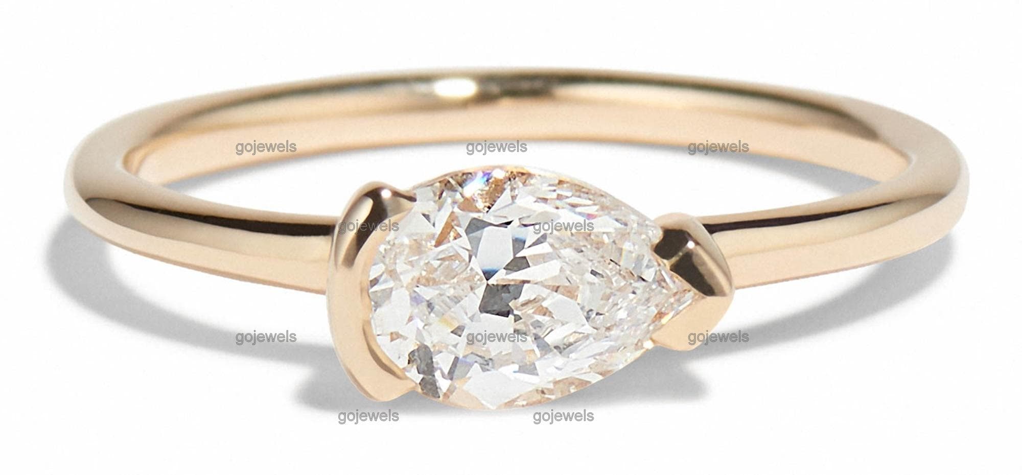 On a Bias Tilted 3CT East West Pear Moissanite Engagement Ring, Solitaire Moissanite Ring, East-West...