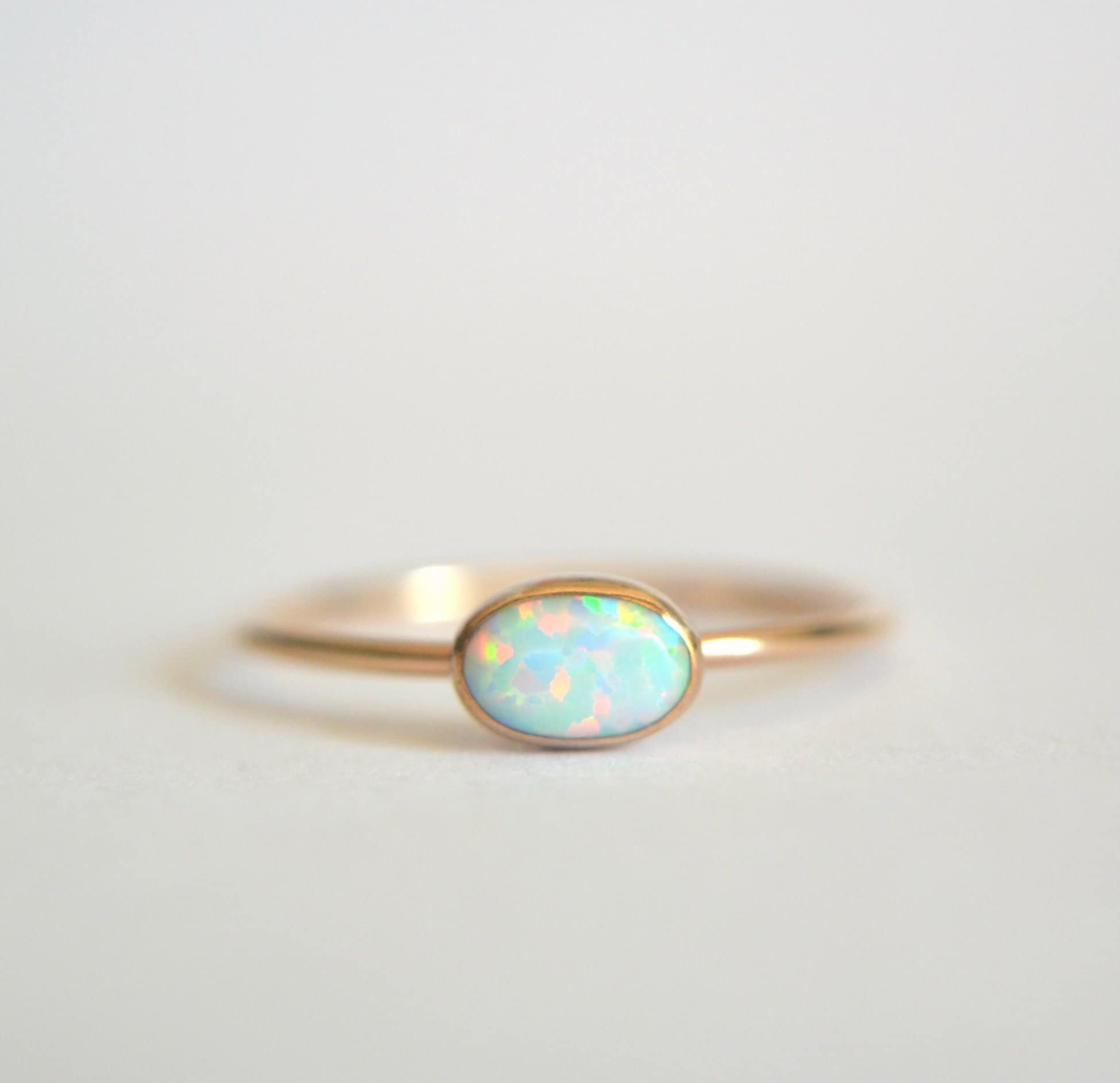 Dainty opal ring with small 6x4mm oval lab grown opal. The stone is set by hand into an oval bezel. ...