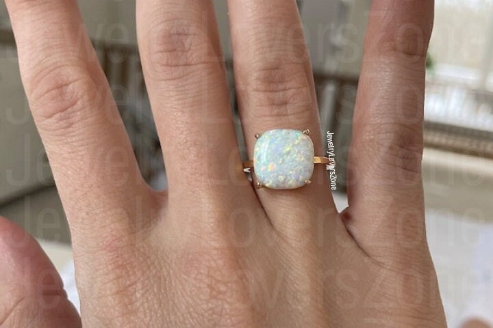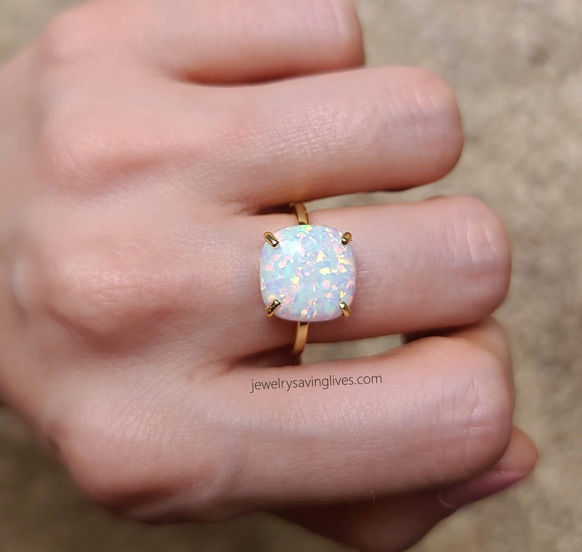 "This Beautiful Ring Features a 8x8mm Cushion Cabochon Lab White Opal and Sterling Silver Finis...