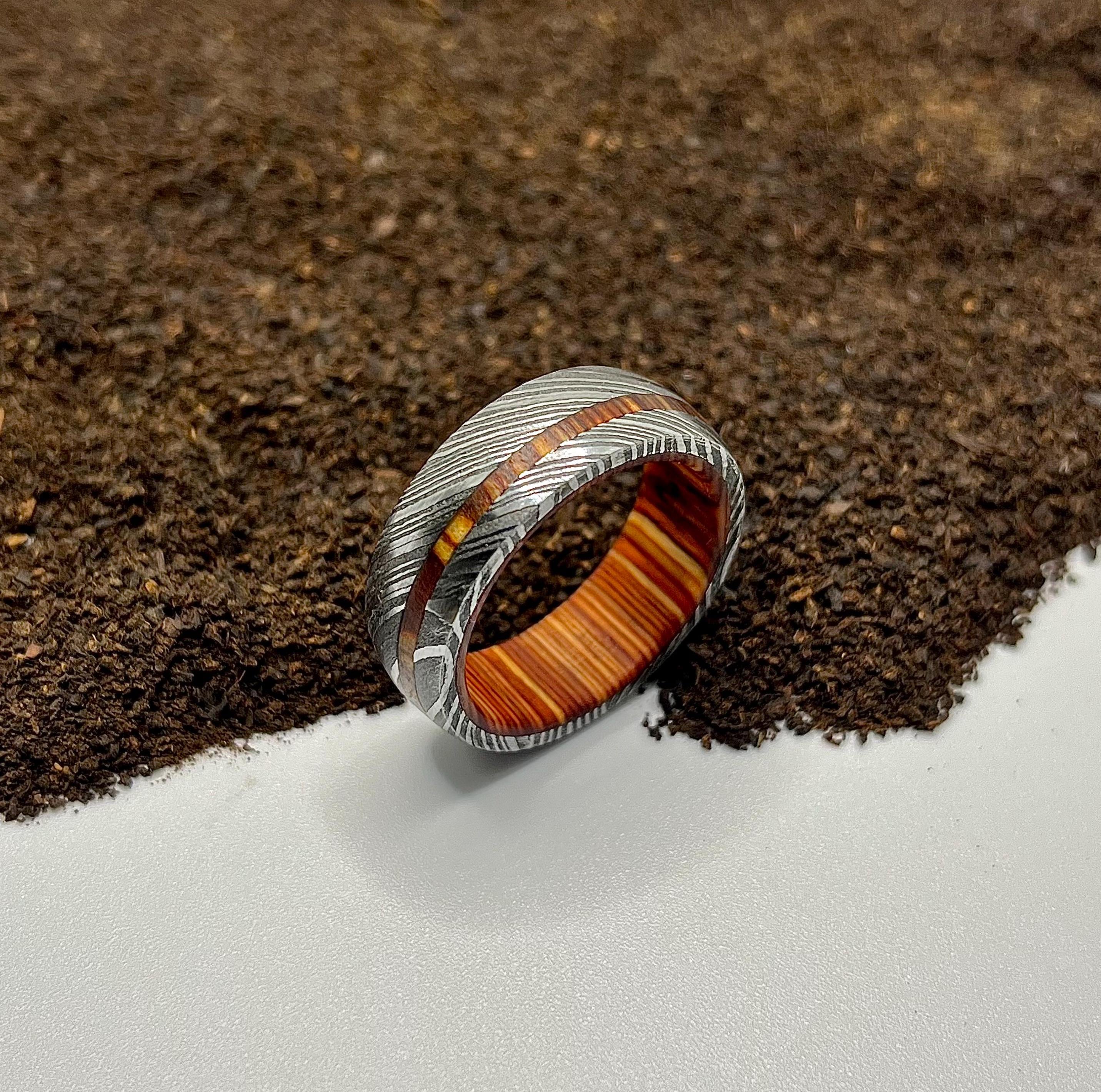 The interior of this damascus steel ring is lined with a Whiskey Barrel sleeve. Whiskey Barrel used ...