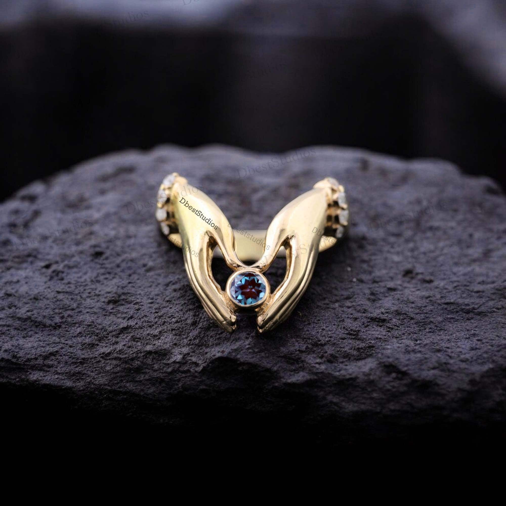 9k Rose Gold Engagement Ring Delicate Diamond Hands Ring Alexandrite Women Ring Unique Friendship Go...