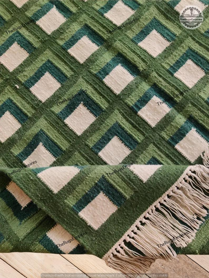 Green Checkered Wool Rug: Scandinavian Kilim Handwoven Area Rug, Modern Luxury Wool Area Rug, Flatwe...