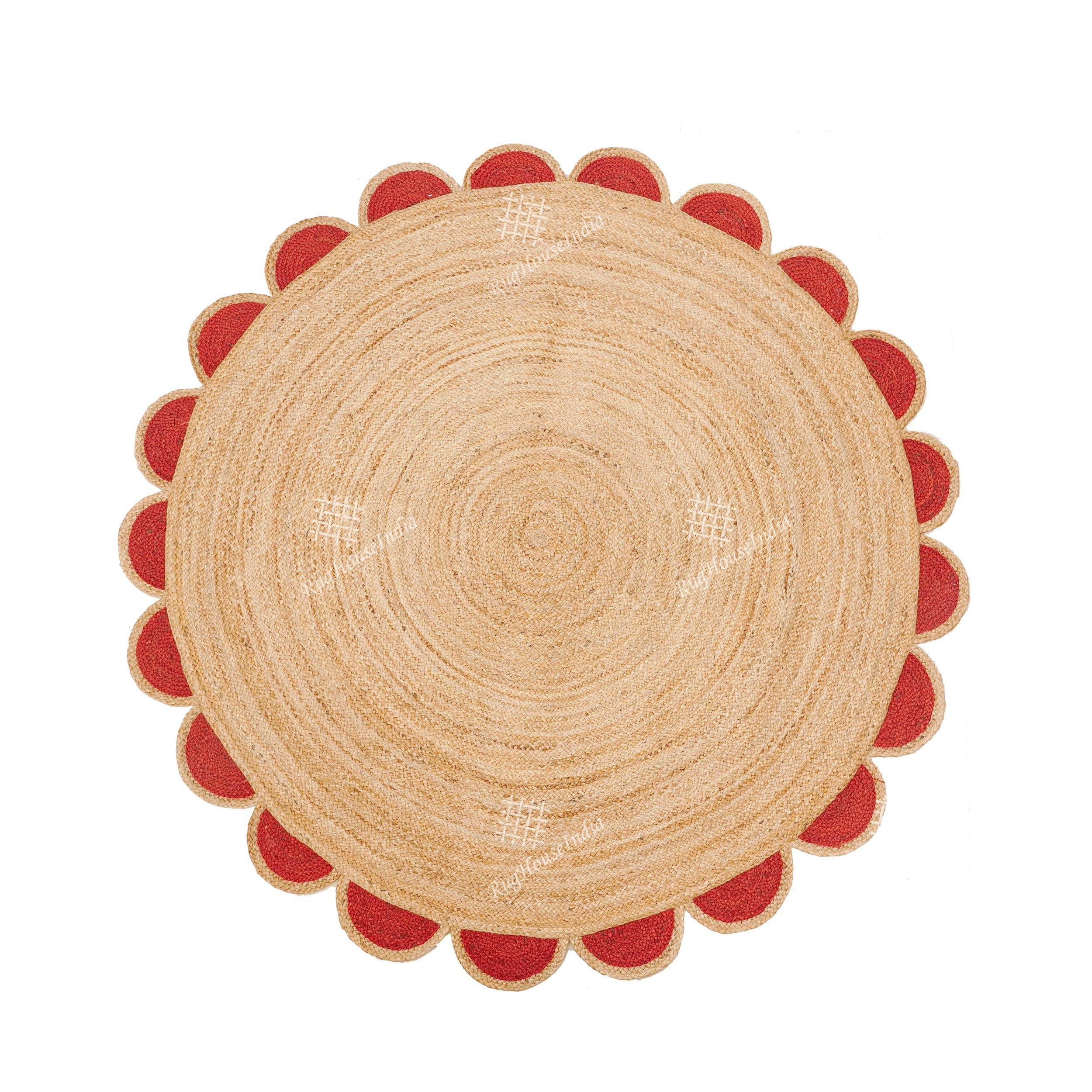6x6 Ft Hand Braided Beige Round Jute Rug With Red Scalloped Rug Boh...