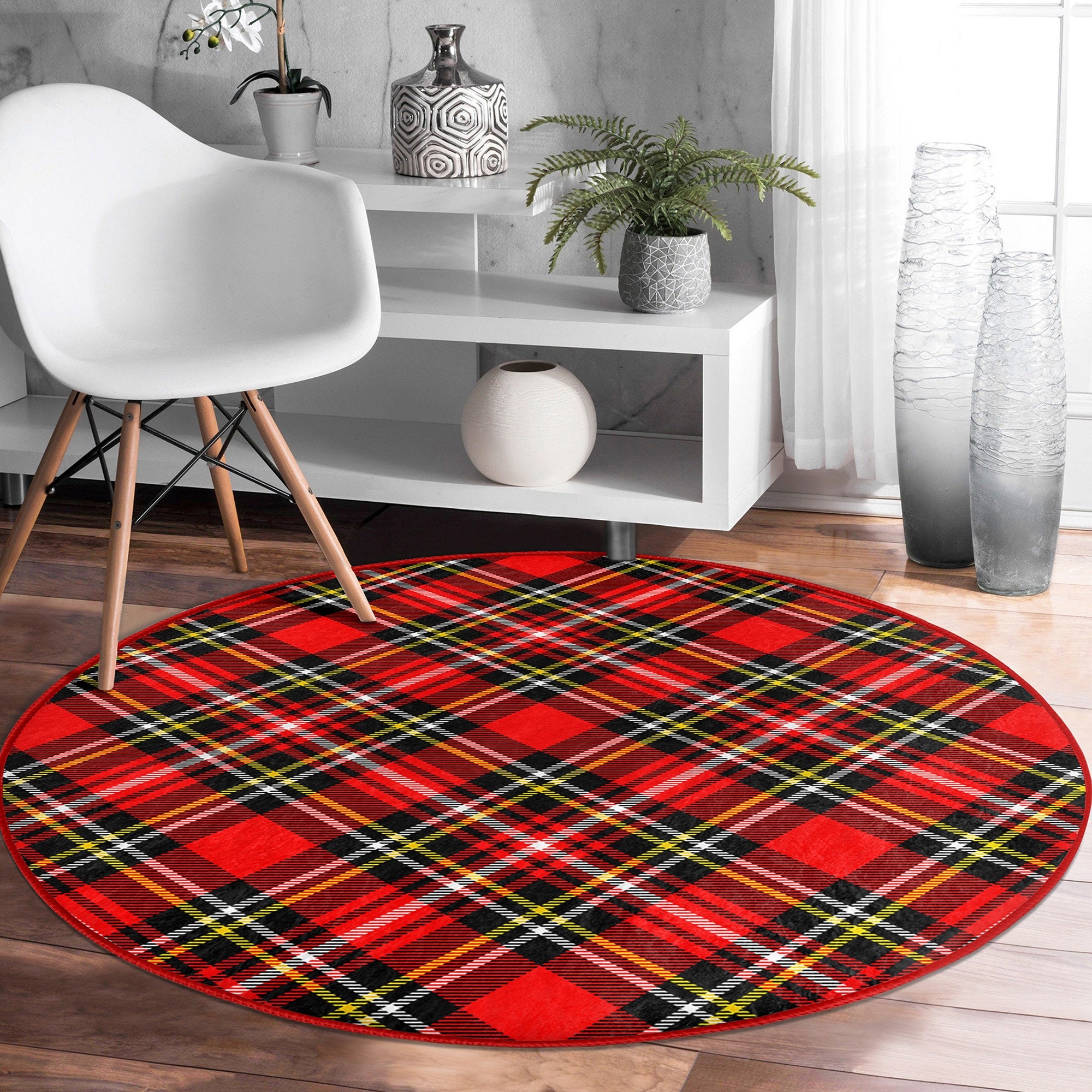 Plaid Round Rug|Non-Slip Round Carpet|Checkered Circle Carpet|Red B...