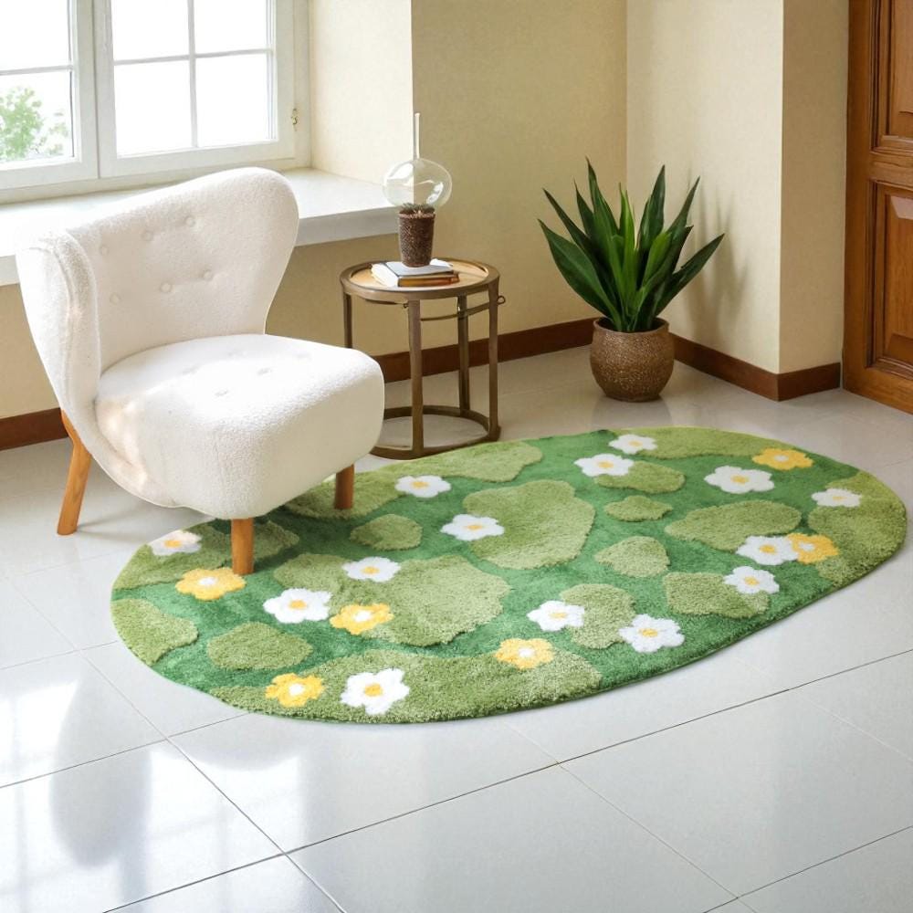 3D Moss Meadow Rug with Daisies - Hand-Tufted Nature-Inspired Art for Your Home Bring the outdoors i...
