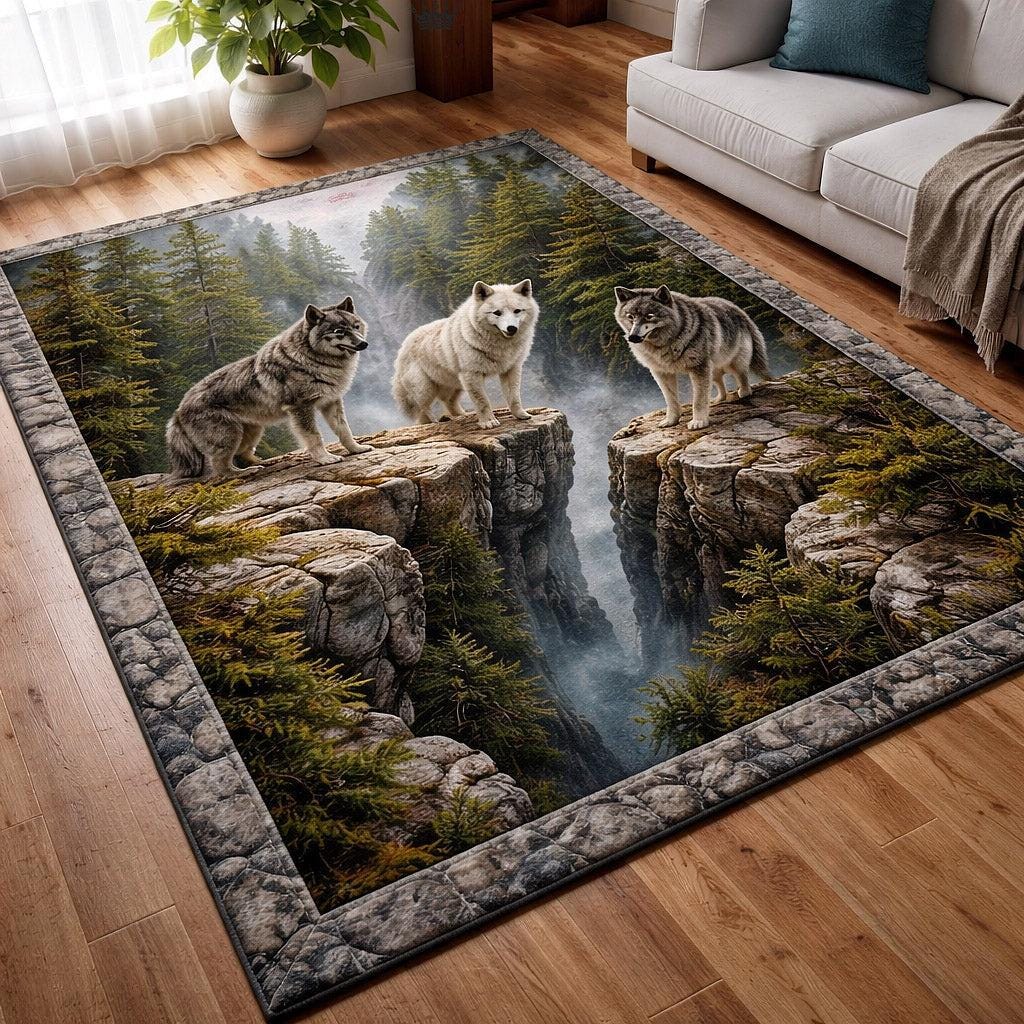 This stunning Wolf Pack Area Rug captures the strength and beauty of wolves standing proudly on rugg...